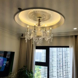 - Căn hộ nhỏ, trần thấp: chọn đèn chùm pha lê mini hoặc đèn thả ngắn để tránh rối mắt.