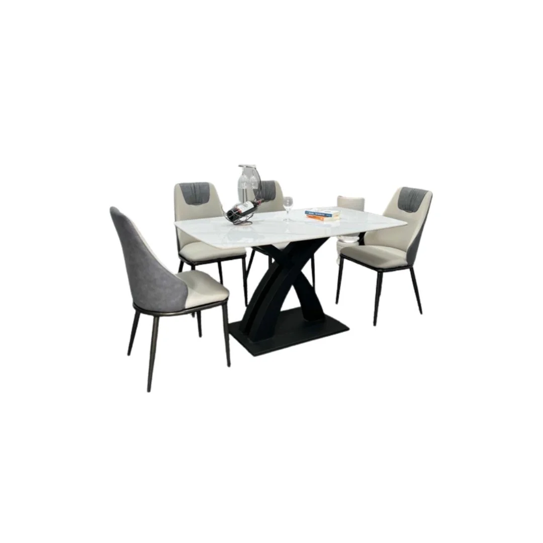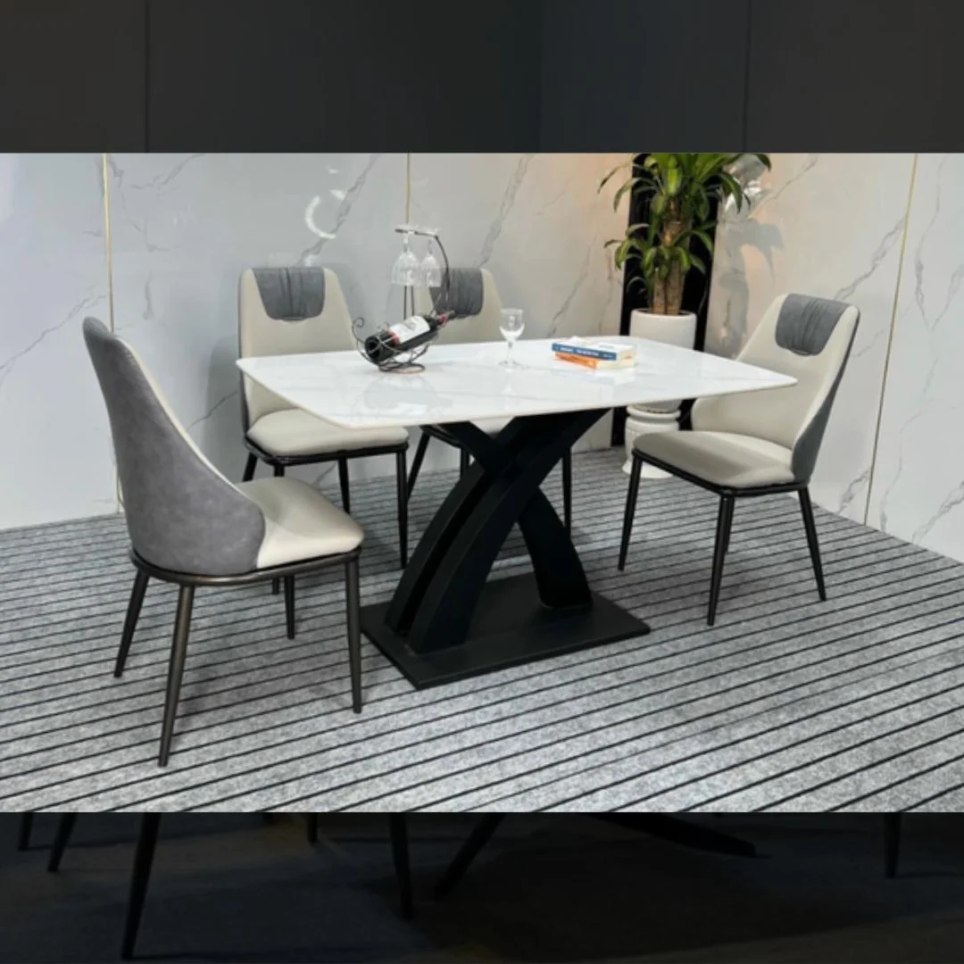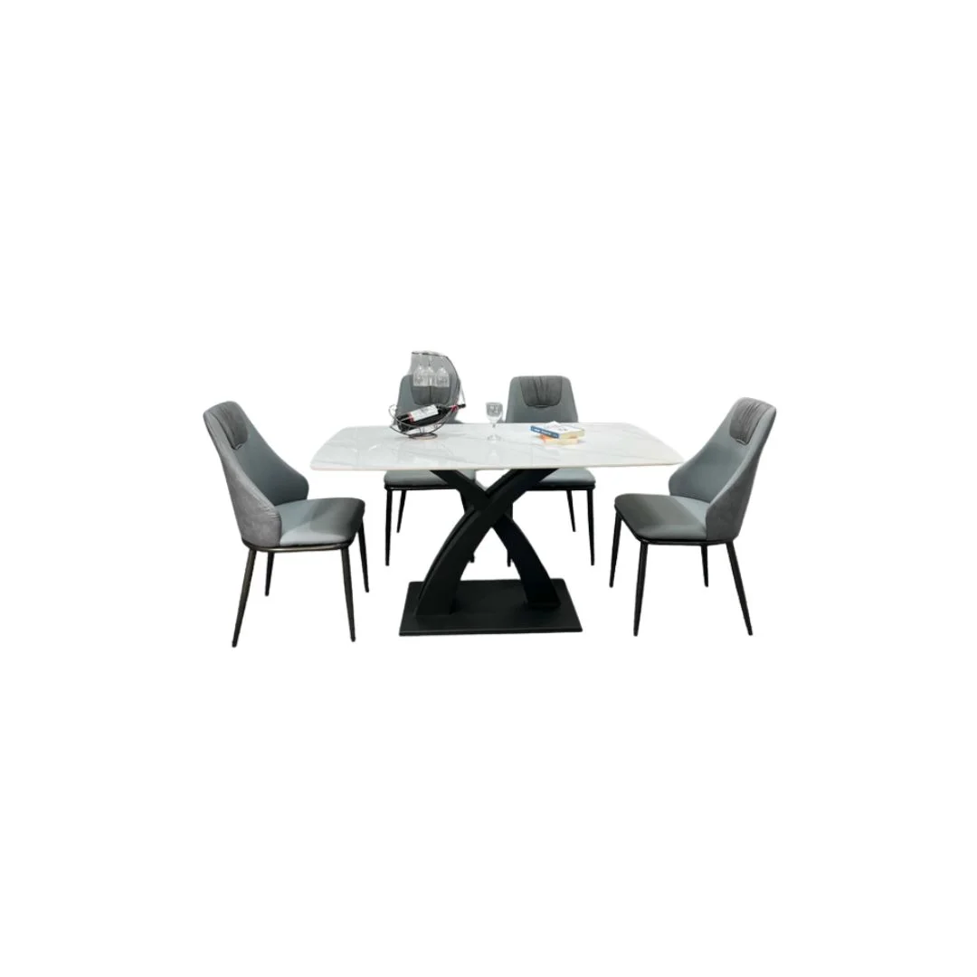 - Chất liệu: Chân bàn, khung ghế hợp kim sắt sơn tĩnh điện; Ghế đệm bọc da PU; Mặt đá ceramic bóng chống ố, chống trầy xước, chịu nhiệt.