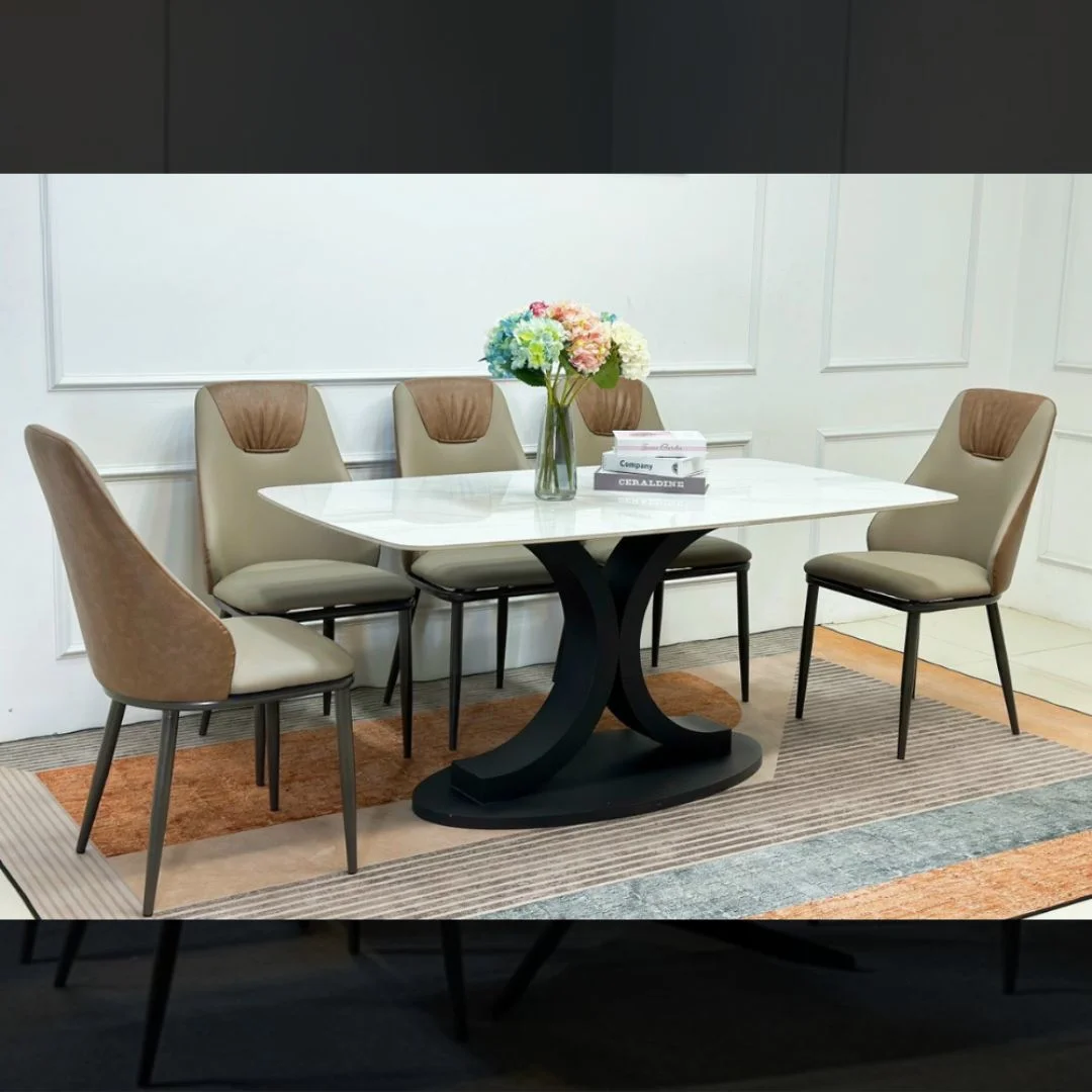 Mặt bàn Ceramic bóng MDB05-CHANEL chữ nhật bo góc mềm mại, bề mặt trắng vân mây bóng sáng giúp phản chiếu ánh sáng, tạo cảm giác rộng rãi. Chân CT001 dạng trụ trung tâm bản rộng, dáng cong cân đối trên đế bầu dục, tạo điểm nhấn hiện đại và vững chãi. Ghế Spot GK21 thiết kế cong ôm lưng, đệm ngồi dày; mảng tựa đầu tạo điểm nhấn thời trang. Chân ghế thon gọn, chắc chắn, dễ phối nhiều phong cách nội thất. Khung hợp kim sắt sơn tĩnh điện chống gỉ; da PU êm và dễ lau; đá ceramic bóng cứng chắc, kháng ố – kháng xước – chịu nhiệt, phù hợp sinh hoạt gia đình.