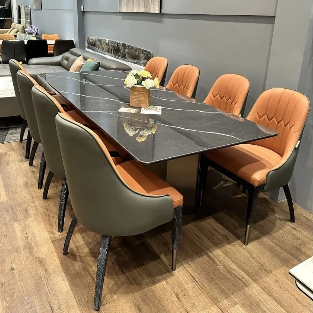 Bàn chữ nhật bo góc mềm an toàn, bề mặt đen vân sọc tạo chiều sâu sang trọng; chân CT025 dáng khối vững chãi, cân đối tổng thể. Ghế Monet Vip lưng rút chỉ, viền bo ôm cơ thể, gam cam nổi bật tạo điểm nhấn ấm áp cho phòng ăn.
