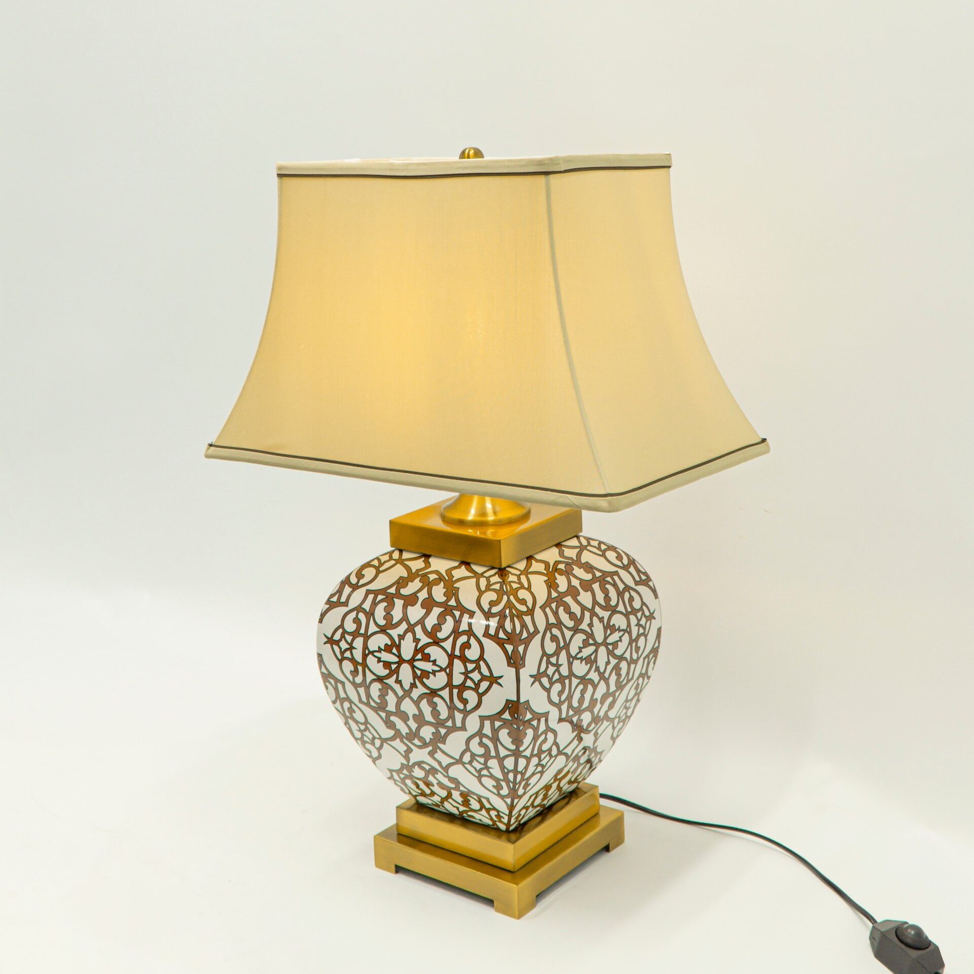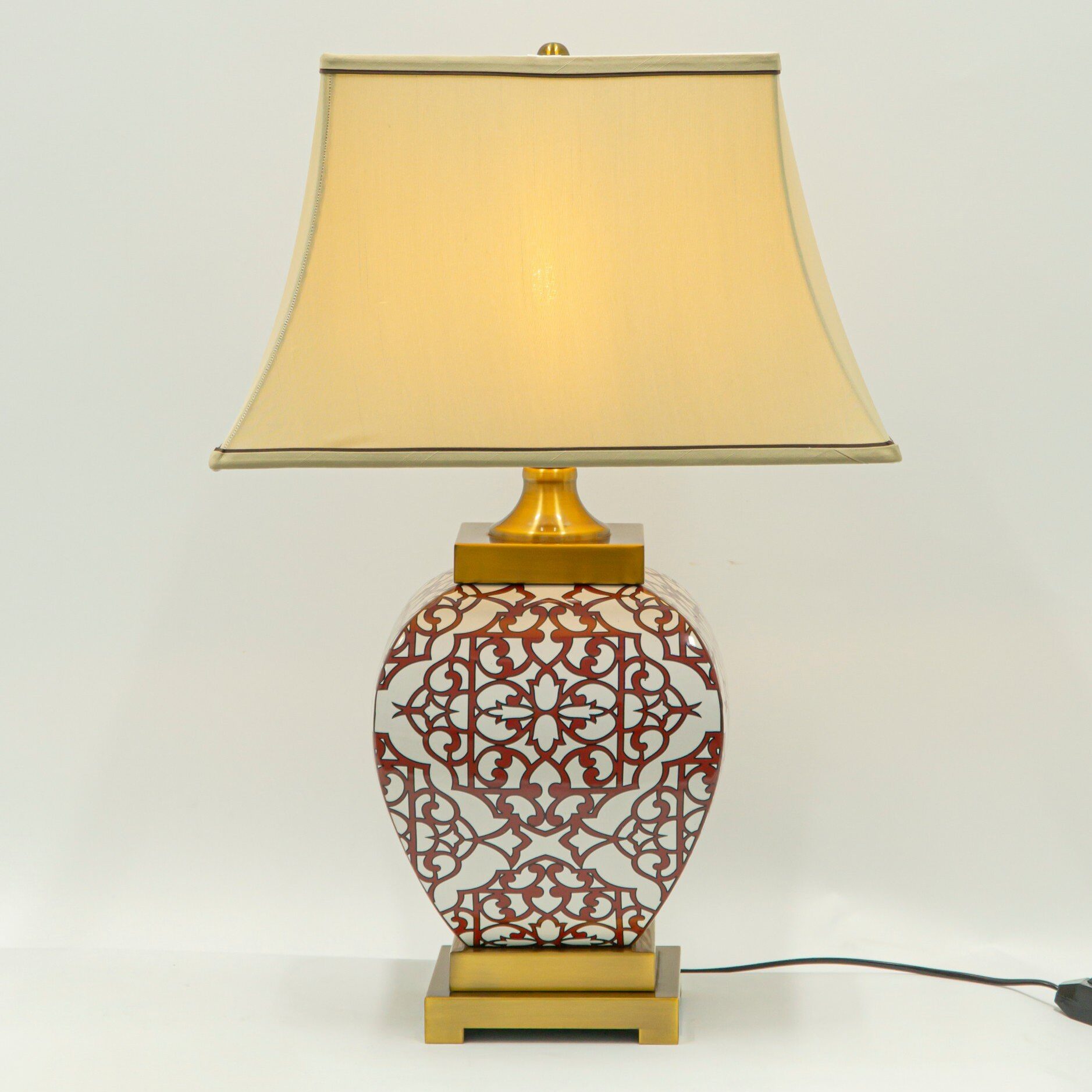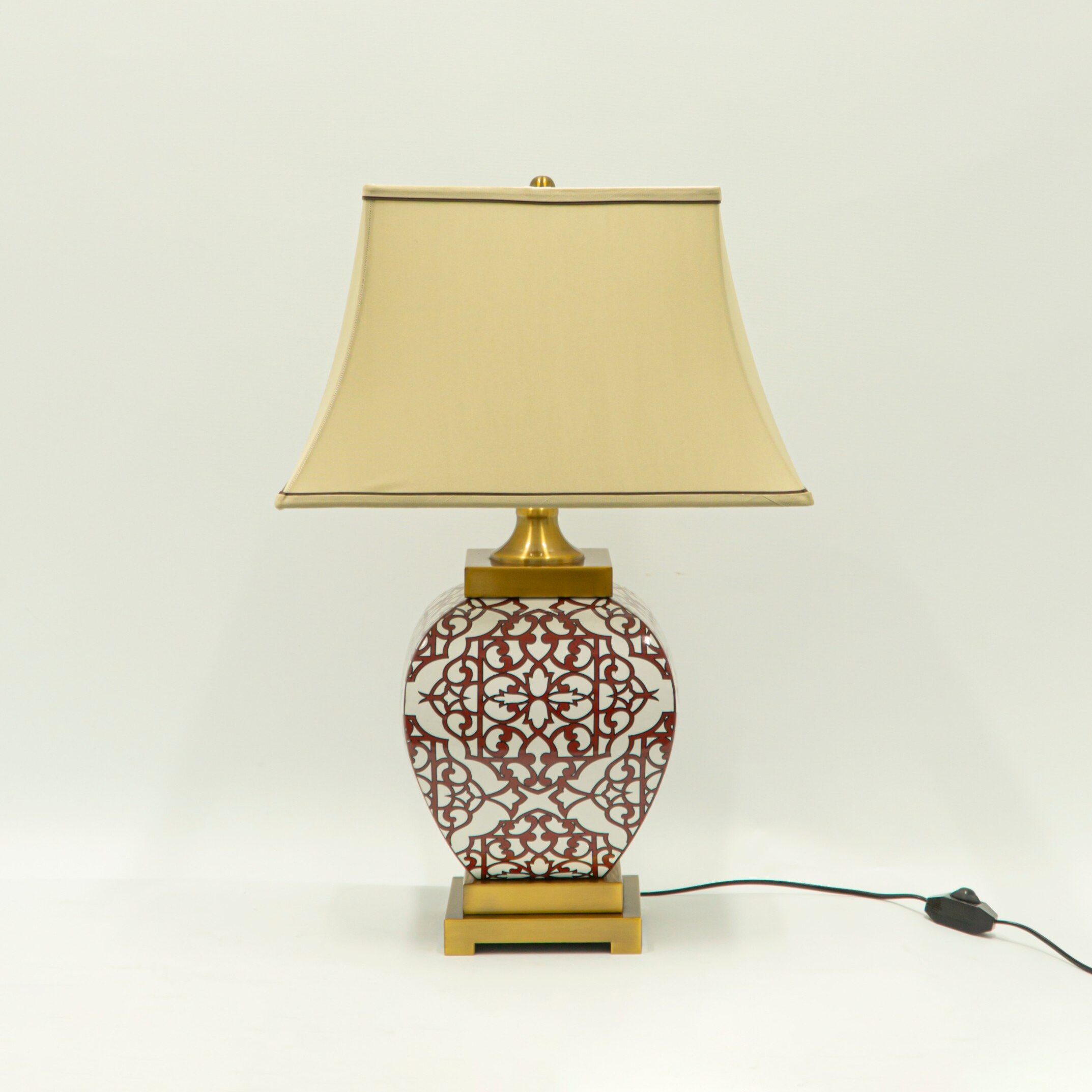 Điểm nhấn của Đèn Bàn Celeste DB82 nằm ở phần thân sứ trang trí hoa văn đối xứng màu nâu đỏ trên nền trắng ngà. Họa tiết gợi liên tưởng đến nghệ thuật gốm sứ truyền thống, đồng thời vẫn hòa hợp với phong cách nội thất tân cổ điển hay hiện đại.