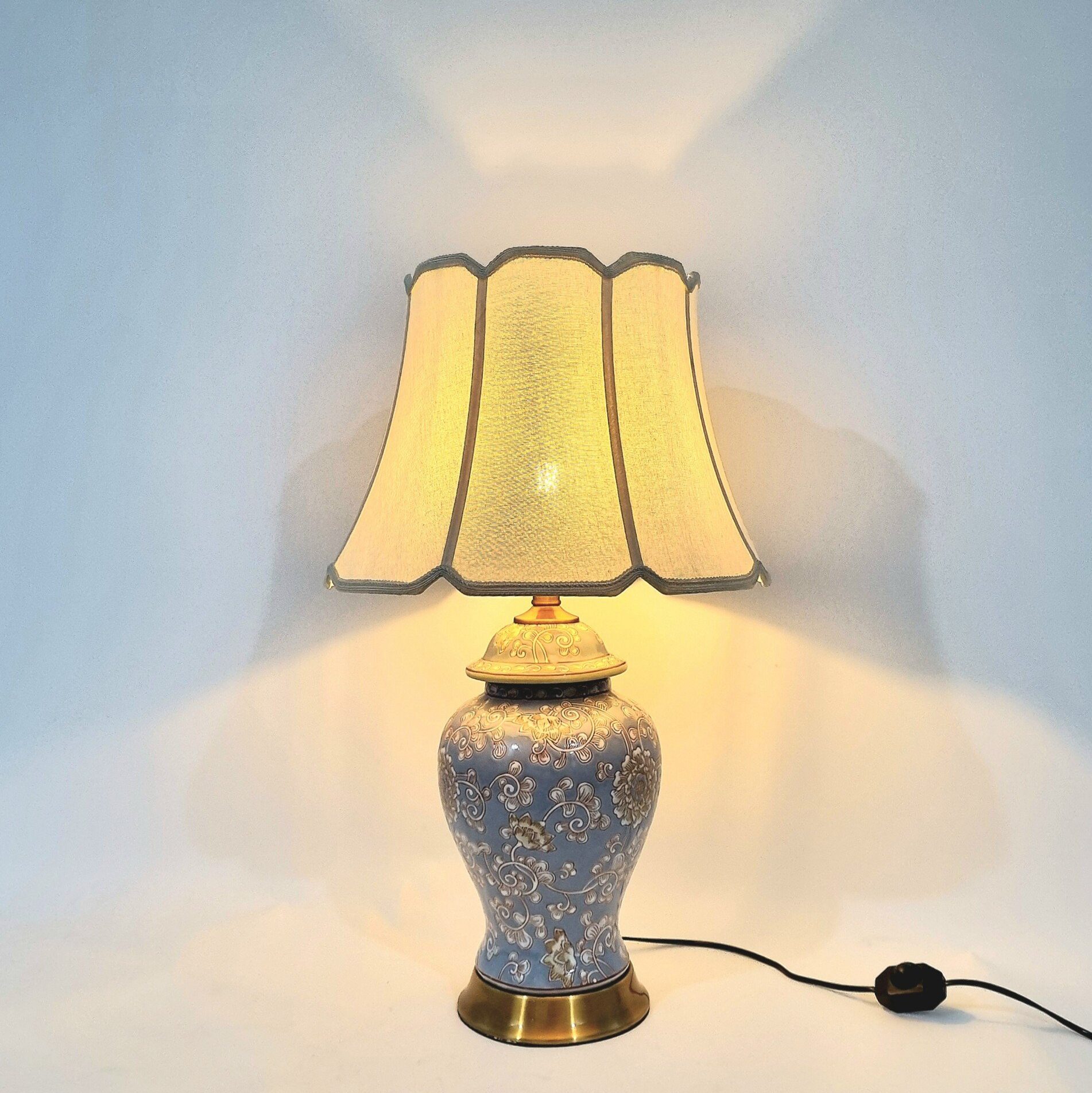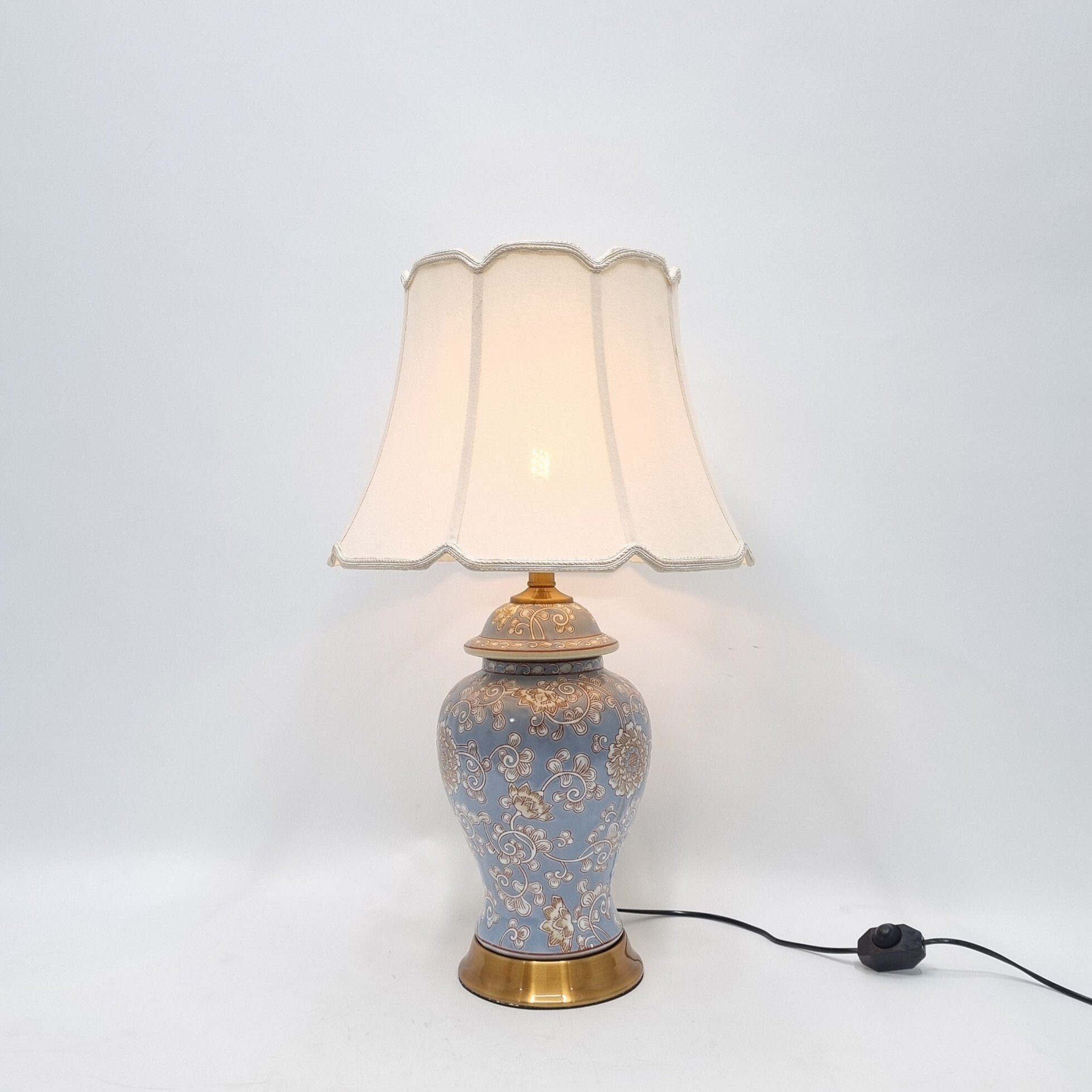 Phần đế và viền kim loại ánh vàng đồng tạo sự vững chắc, đồng thời cân bằng tổng thể thiết kế. Sự kết hợp giữa sứ, vải, và kim loại không chỉ nâng cao giá trị thẩm mỹ mà còn bảo đảm độ bền khi sử dụng lâu dài.