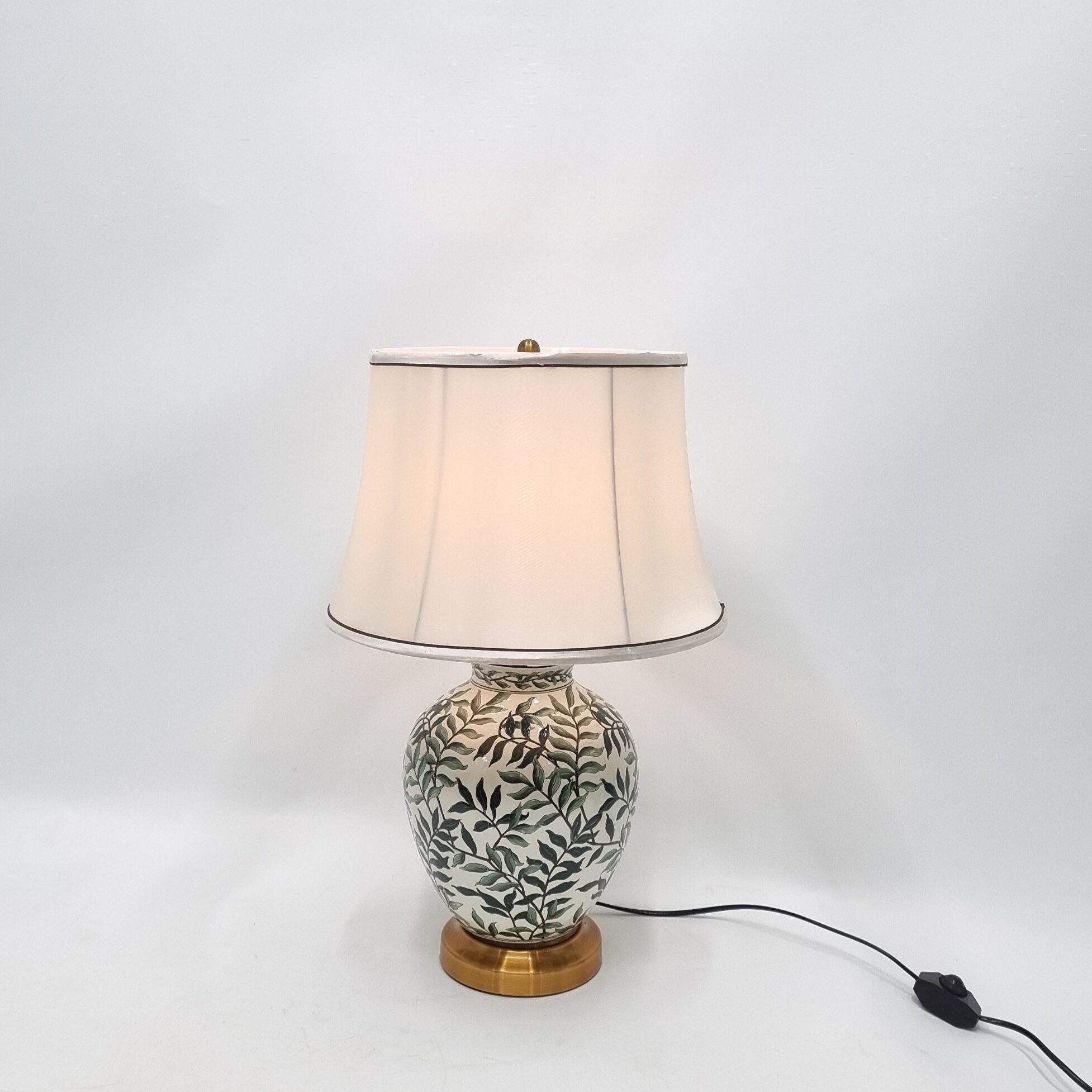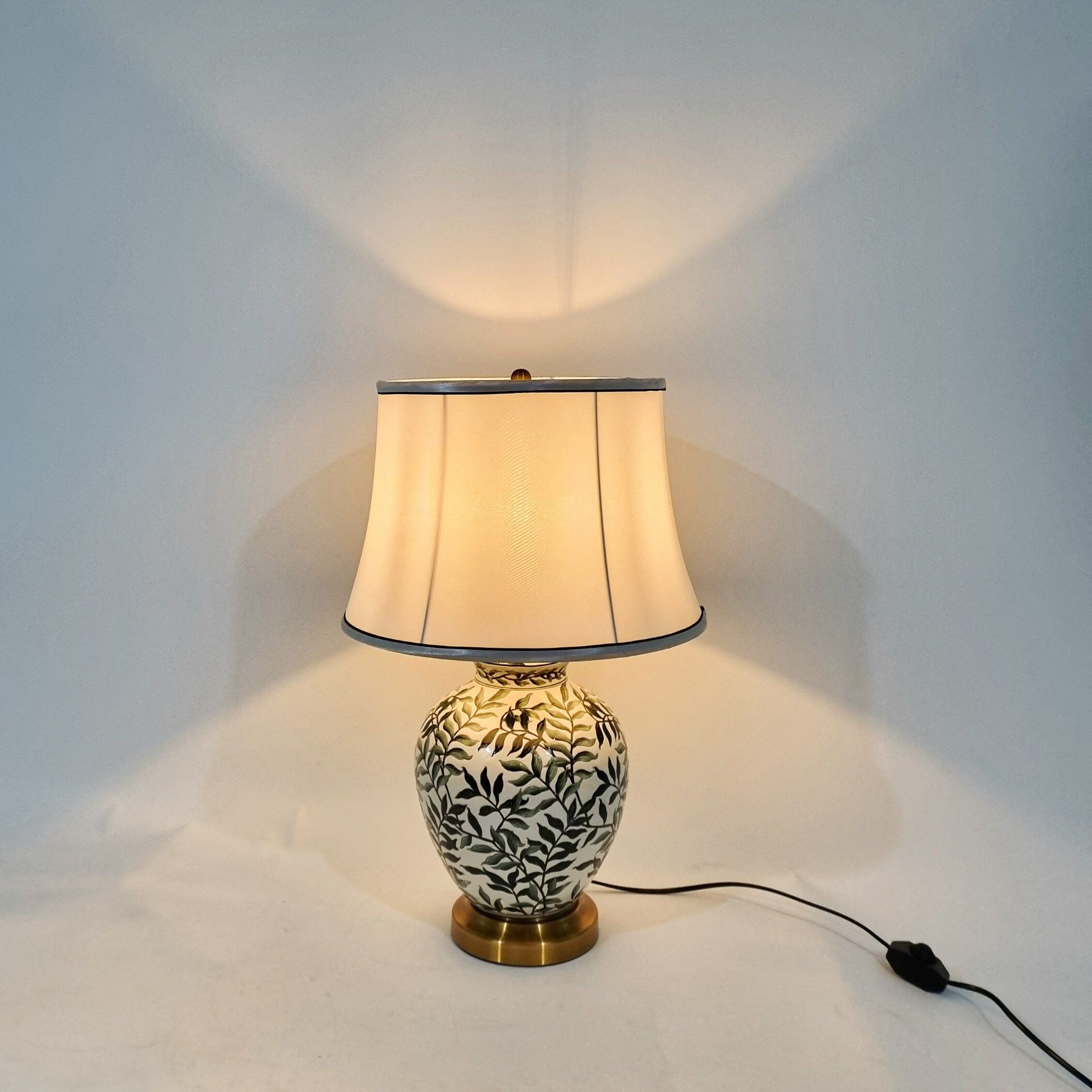 Điểm nhấn của Đèn Bàn Jasper DB84 nằm ở phần thân sứ phủ họa tiết lá xanh mềm mại trên nền trắng ngà. Hoa văn gợi nhớ đến thiên nhiên, mang lại cảm giác thanh bình và cân bằng thị giác.