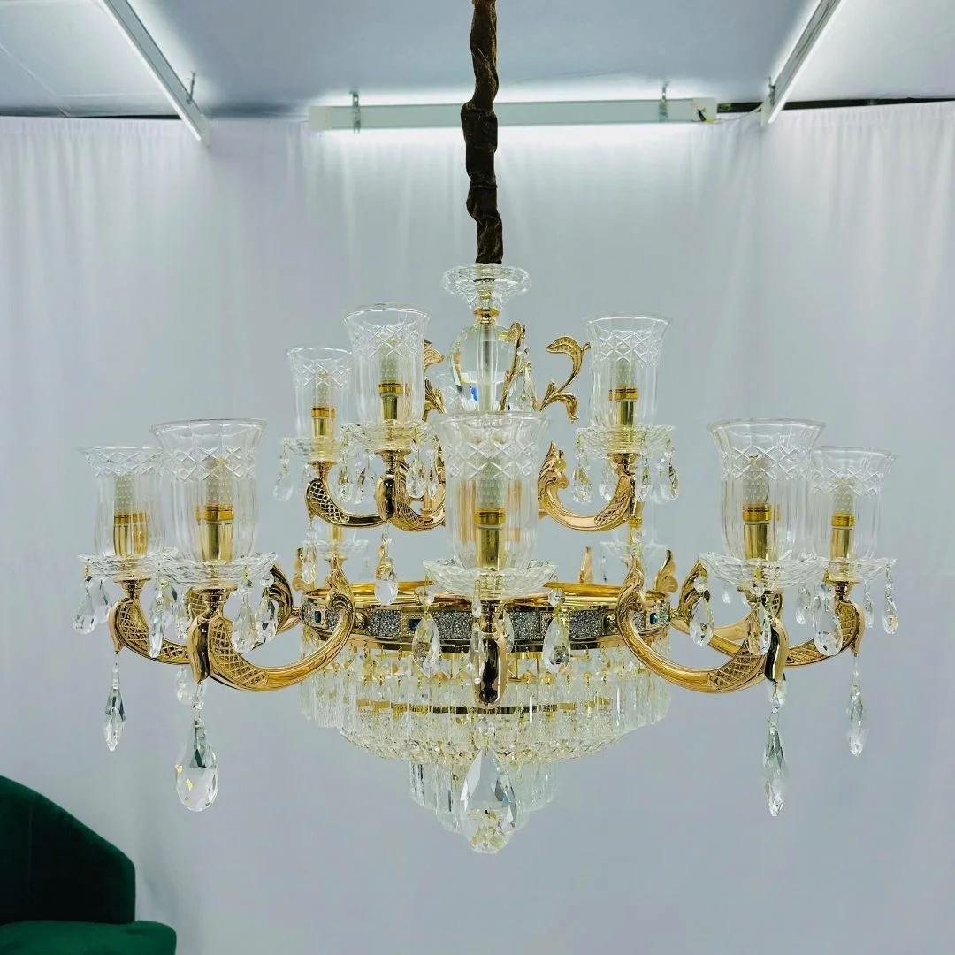 DC6651T8 Ø850 × H570 Thân đồng + pha lê K9 cao cấp E14 E14 x 8 – Trên tay, E14 x 4 – Lớp pha lê