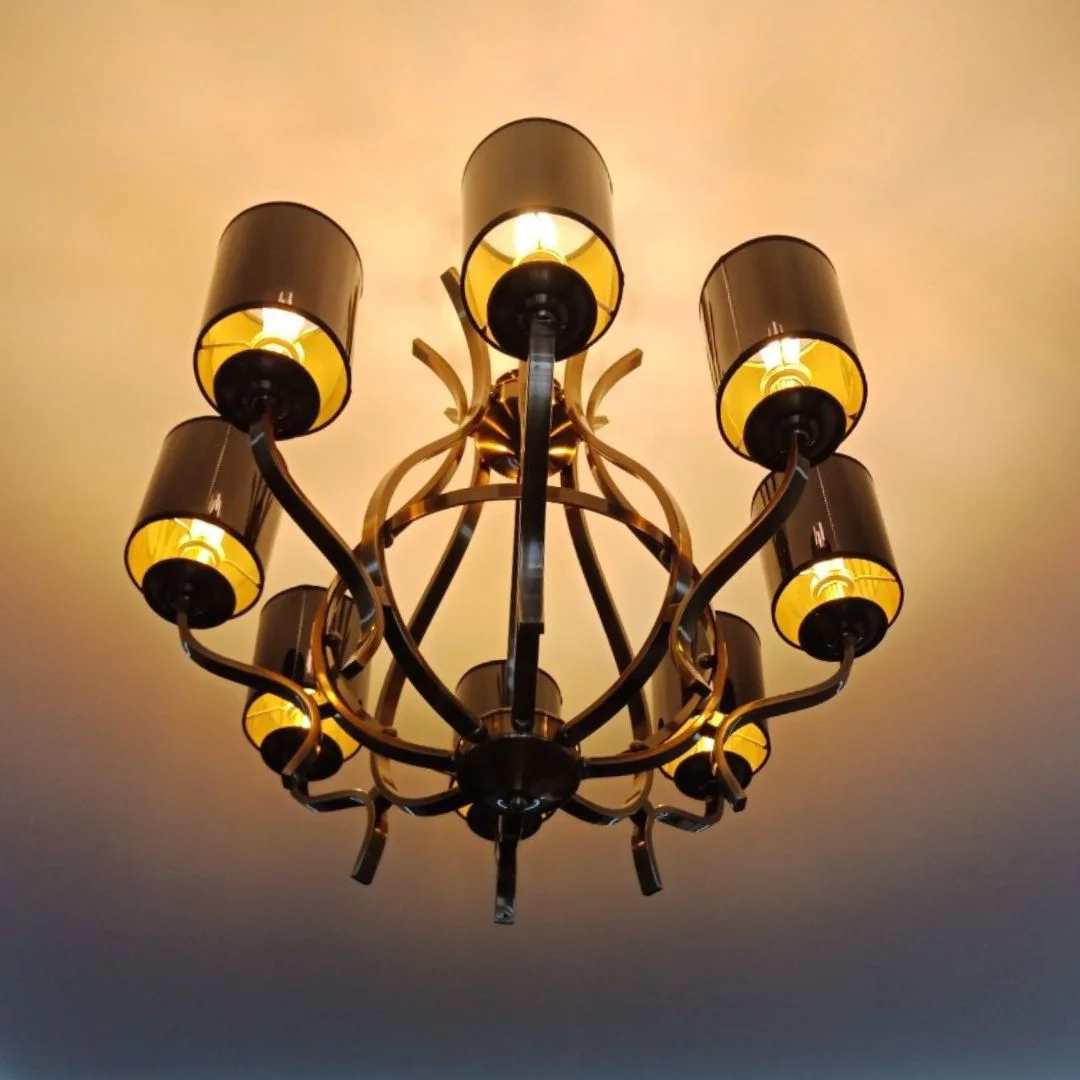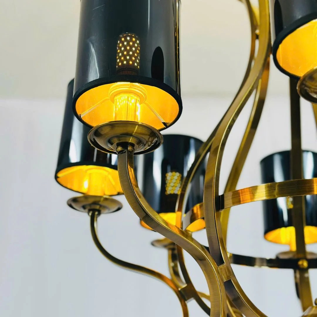 Đèn Chùm DC9018 gây ấn tượng mạnh mẽ với thiết kế uốn lượn mềm mại, mang dáng vẻ cổ điển nhưng vẫn giữ được nét hiện đại tinh tế. Phần chao đèn sử dụng gam màu đen bóng sang trọng, kết hợp cùng ánh sáng vàng ấm, tạo nên hiệu ứng thị giác cuốn hút và ấm cúng.