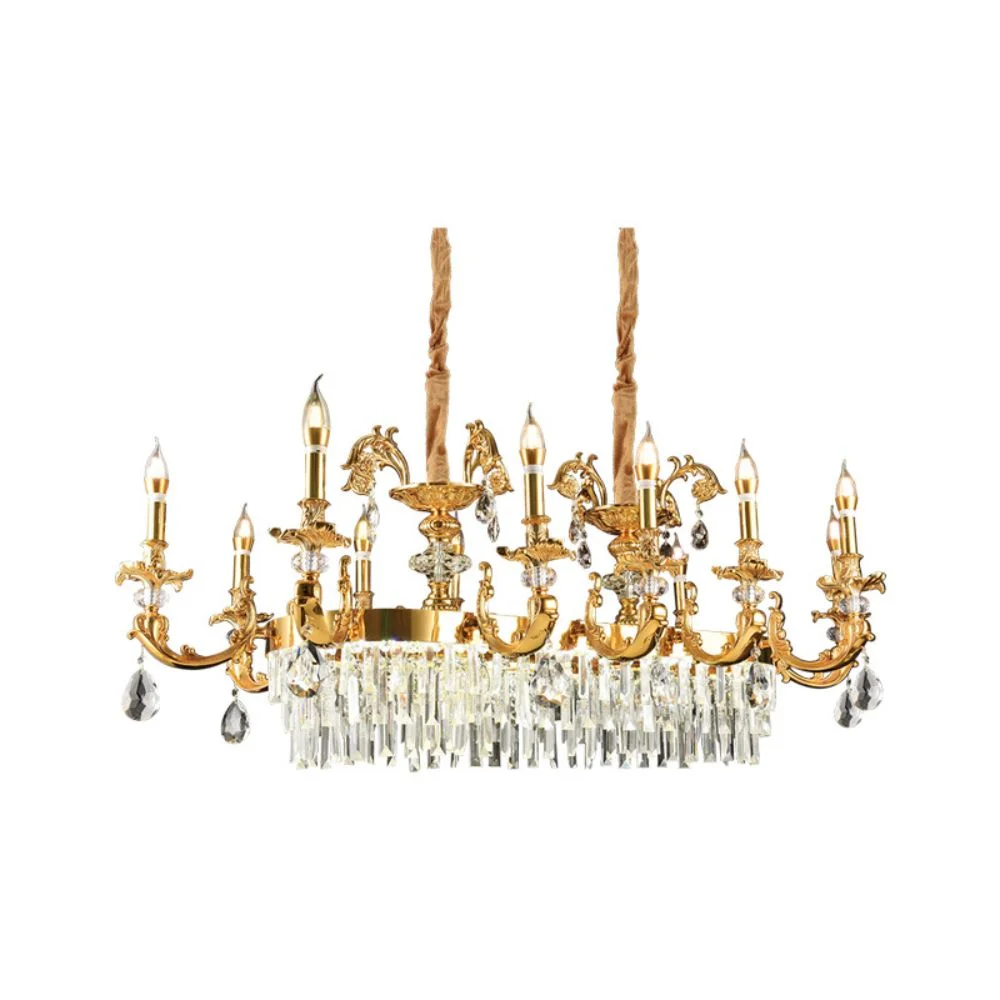 Đèn sử dụng 12 bóng E14 ở phần trên tay đèn, kết hợp hệ thống LED chạy dọc trong thân. Sự kết hợp này giúp ánh sáng tỏa đều hơn, vừa tiết kiệm điện vừa tăng tuổi thọ chiếu sáng. Khung đèn chắc chắn, liên kết vững, đảm bảo an toàn khi lắp đặt.