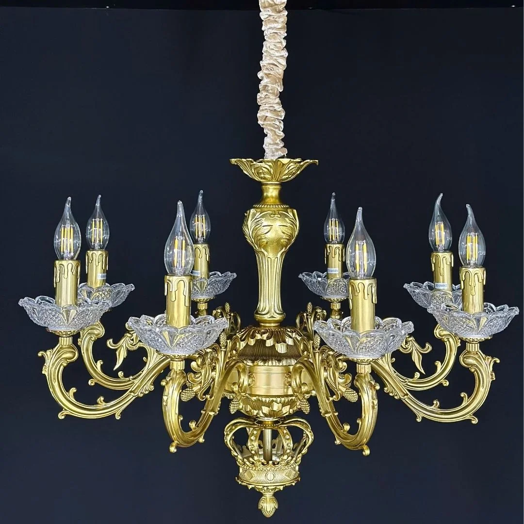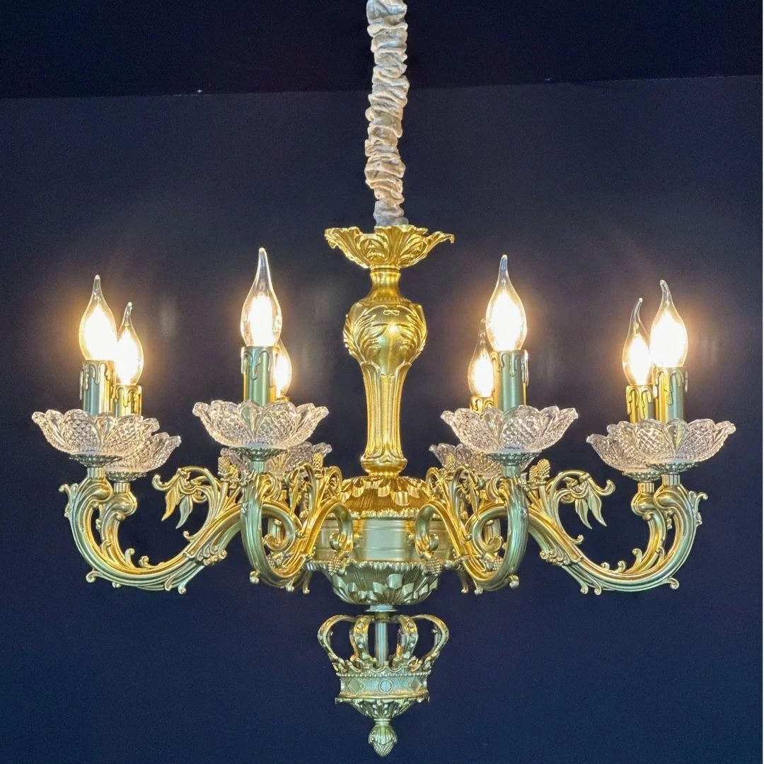 Đèn Chùm DC9116T8 mang tinh thần cổ điển Châu Âu với thân hợp kim đúc mạ vàng đồng, chạm khắc hoa văn nổi tinh xảo. Tám tay đèn uốn cong cân đối, đỡ các chao pha lê tạo hình “đài hoa”, giúp khúc xạ ánh sáng lung linh nhưng vẫn dịu mắt. Kích thước Ø700 x H430 treo gọn trong phòng khách, bàn ăn hay sảnh nhỏ. Chất liệu hợp kim dày dặn chống cong vênh, lớp mạ bền màu hạn chế oxy hóa; pha lê K9 trong, cắt giác sắc nét giúp Đèn Chùm DC9116T8 tỏa sáng sang trọng và dễ vệ sinh, thay bóng E14 nhanh chóng.