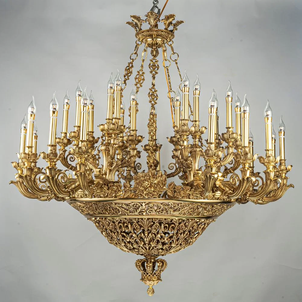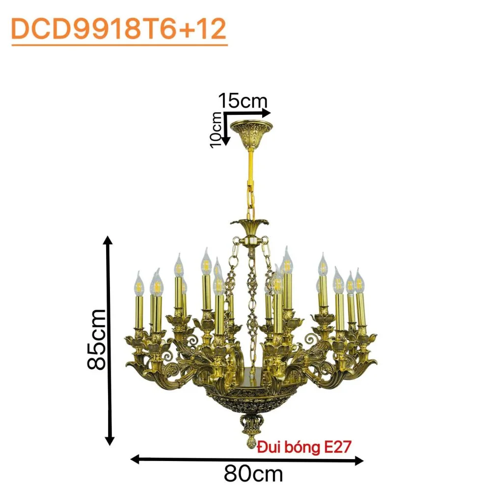 Đèn Chùm Đồng Nến DCD9918 gồm ba phiên bản: DCD9918T6+12, DCD9918T8+16 và DCD9918T35, mang đến vẻ đẹp cổ điển kết hợp cùng sự sang trọng tinh tế, phù hợp cho các không gian như phòng khách, biệt thự, sảnh lớn hay nhà hàng cao cấp. Mỗi phiên bản có kích thước và số lượng bóng đèn khác nhau – từ mẫu D900 x H700 mm với 18 bóng E14, đến D1000 x H800 mm với 24 bóng E14, và lớn nhất là D1500 x H1100 mm với 35 bóng E14 – giúp người dùng dễ dàng lựa chọn theo diện tích và phong cách nội thất mong muốn.