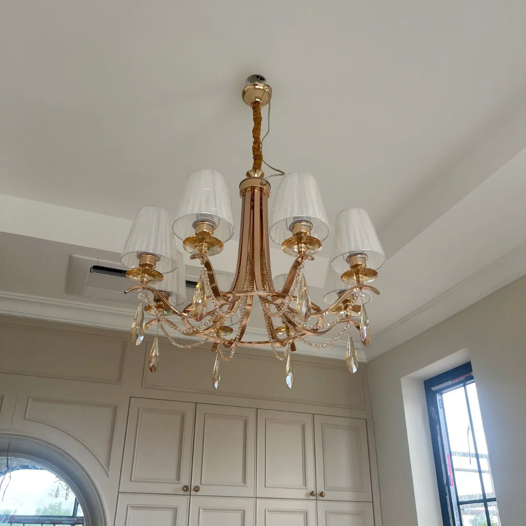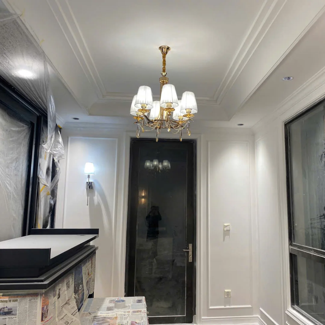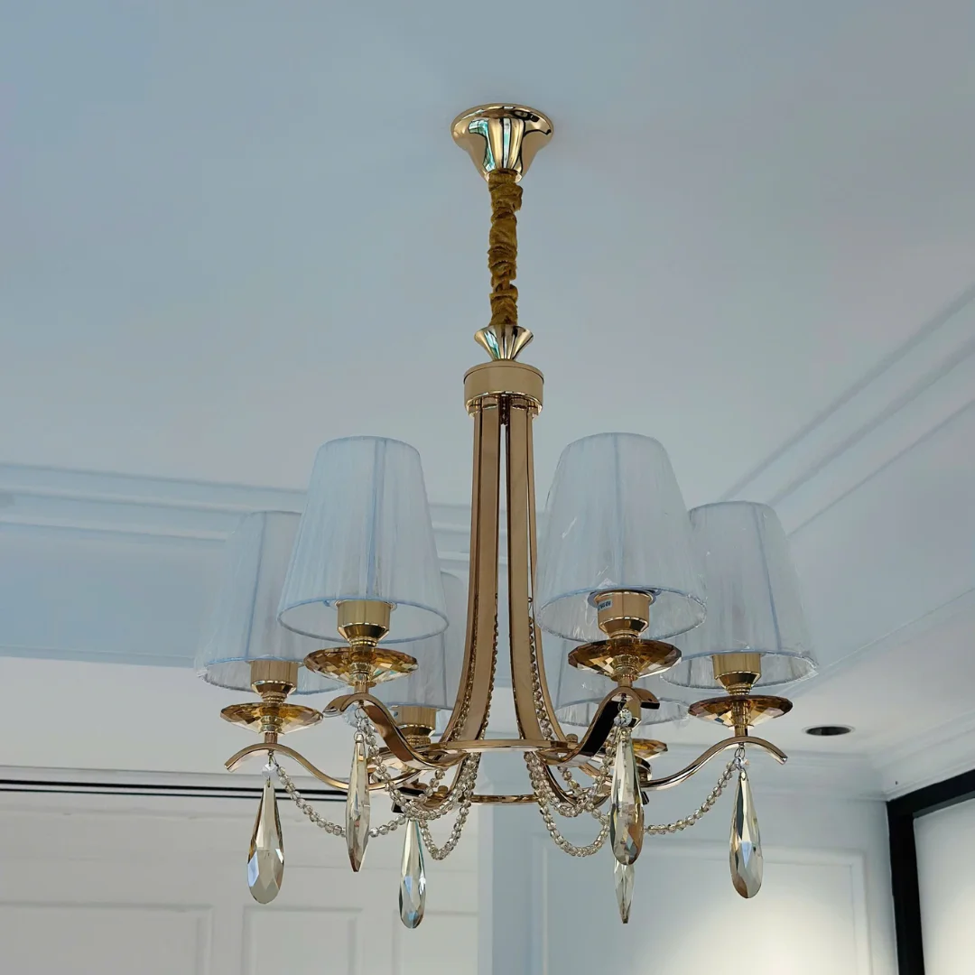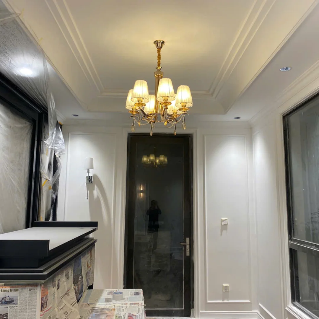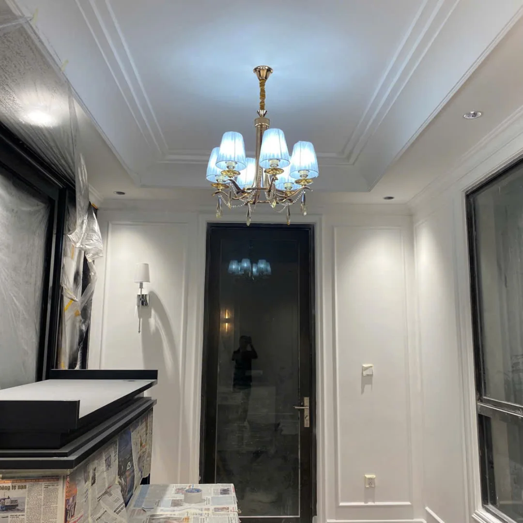 | DC234T6 | Ø600 × H500 | E27 | 6 bóng | Khung kim loại mạ màu, chao vải trắng, hạt pha lê |