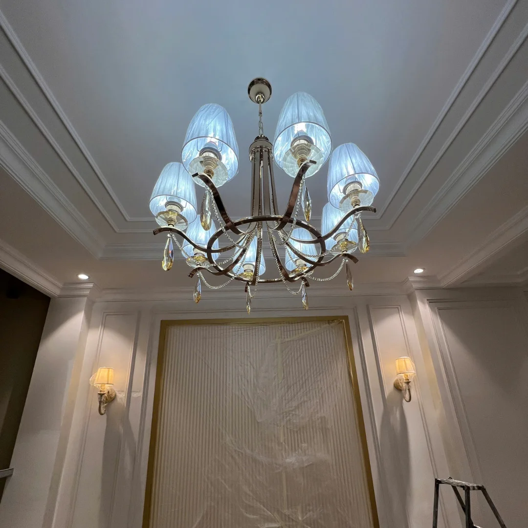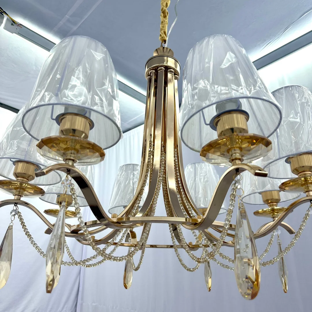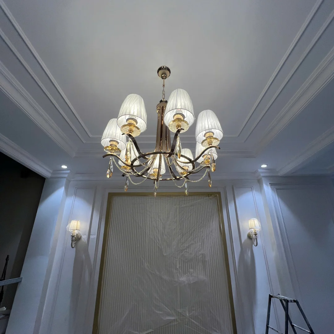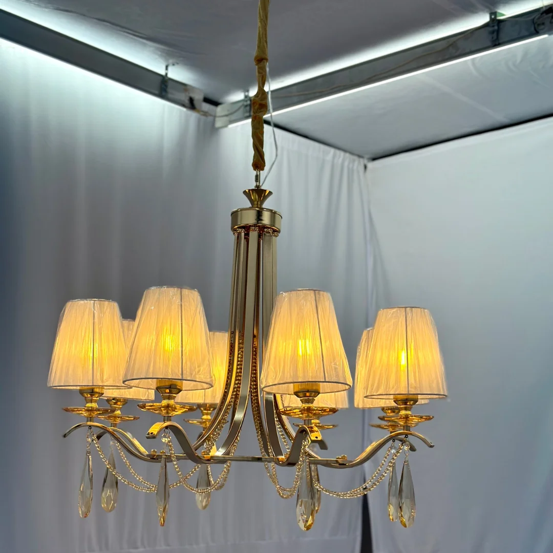 | DC234T8 | Ø780 × H500 | E27 | 8 bóng | Khung kim loại mạ màu, chao vải trắng, hạt pha lê |