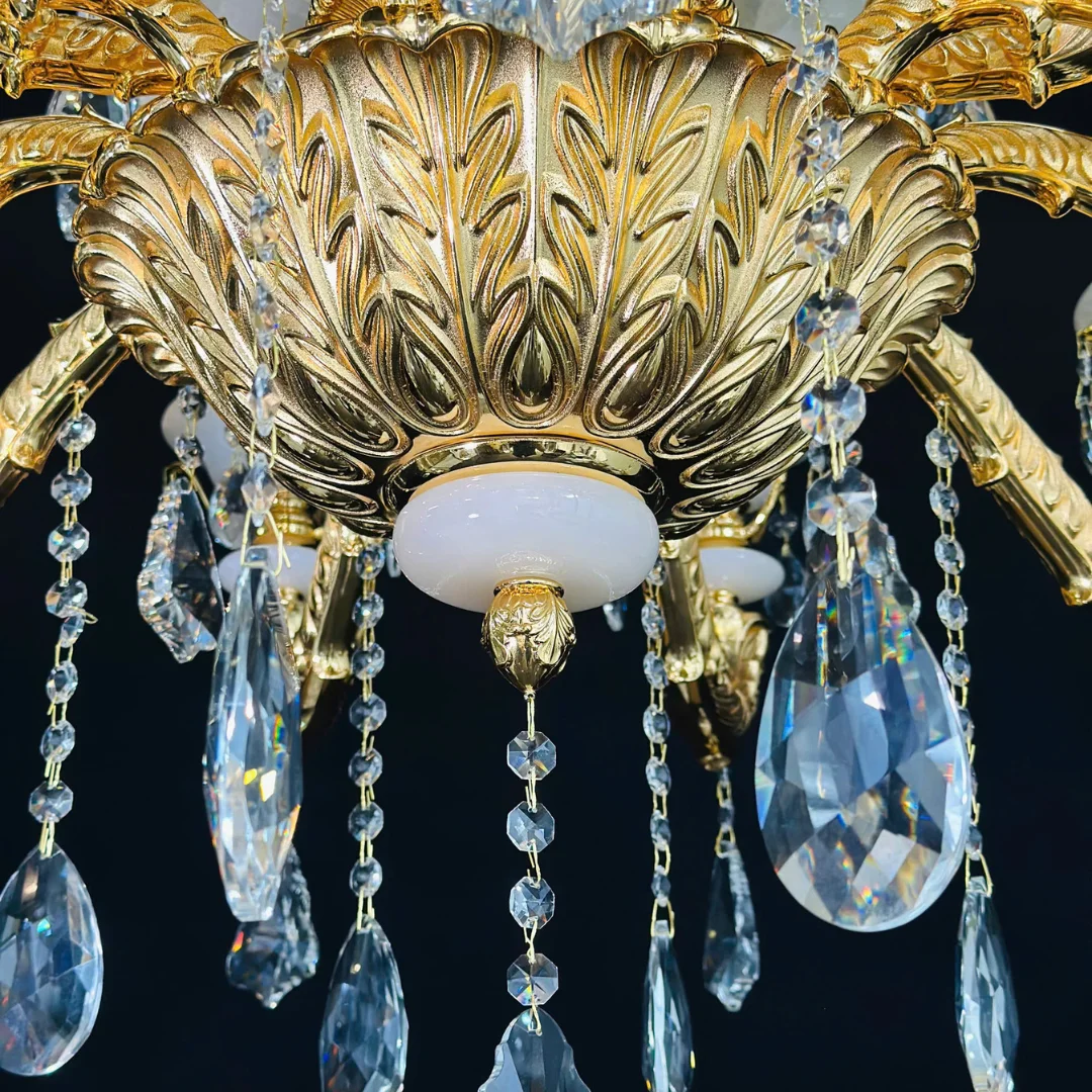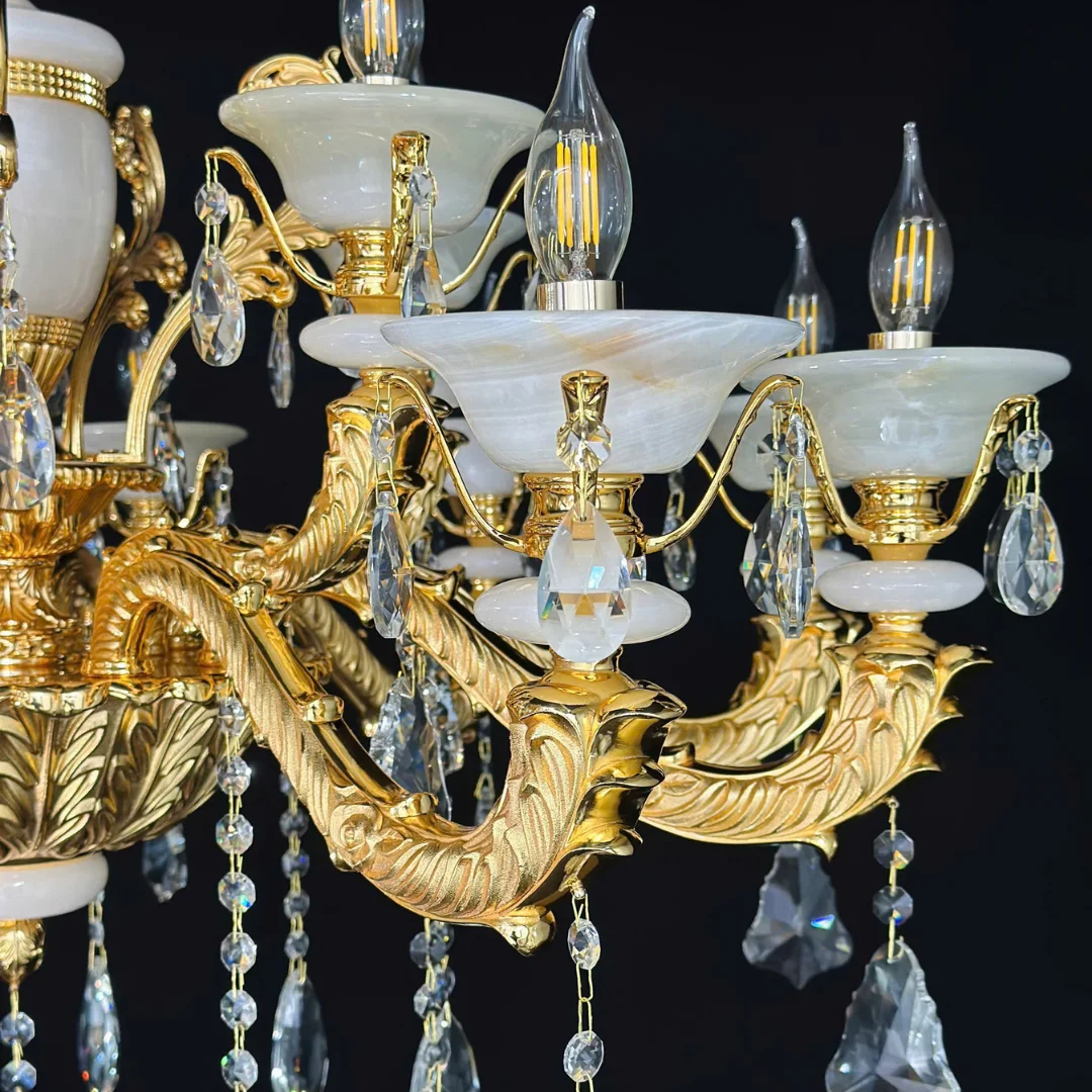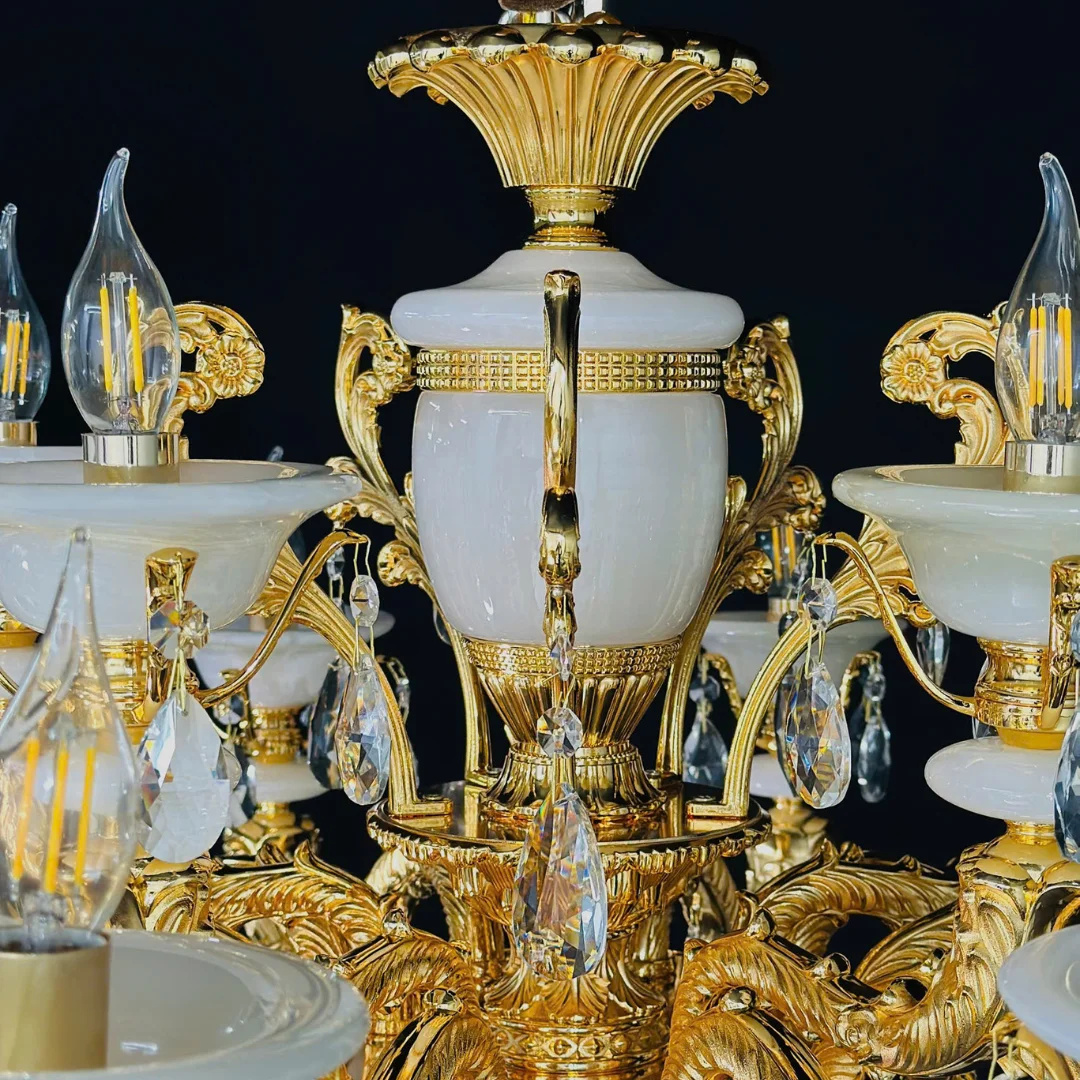 Đèn Chùm Pha Lê DC6239 mang dáng chùm nến cổ điển với các tay đèn uốn cong cân đối, tạo cảm giác “đầy” và sang khi treo ở trung tâm trần. Điểm dễ nhận thấy là các chao đá màu trắng sữa giúp tổng thể thanh lịch hơn, đồng thời làm ánh sáng tỏa mềm, giảm cảm giác chói. Phần khung tông vàng ấm kết hợp các đường nét chạm khắc tạo vẻ cao cấp, hợp với nội thất tân cổ điển hoặc không gian cần điểm nhấn sang trọng.