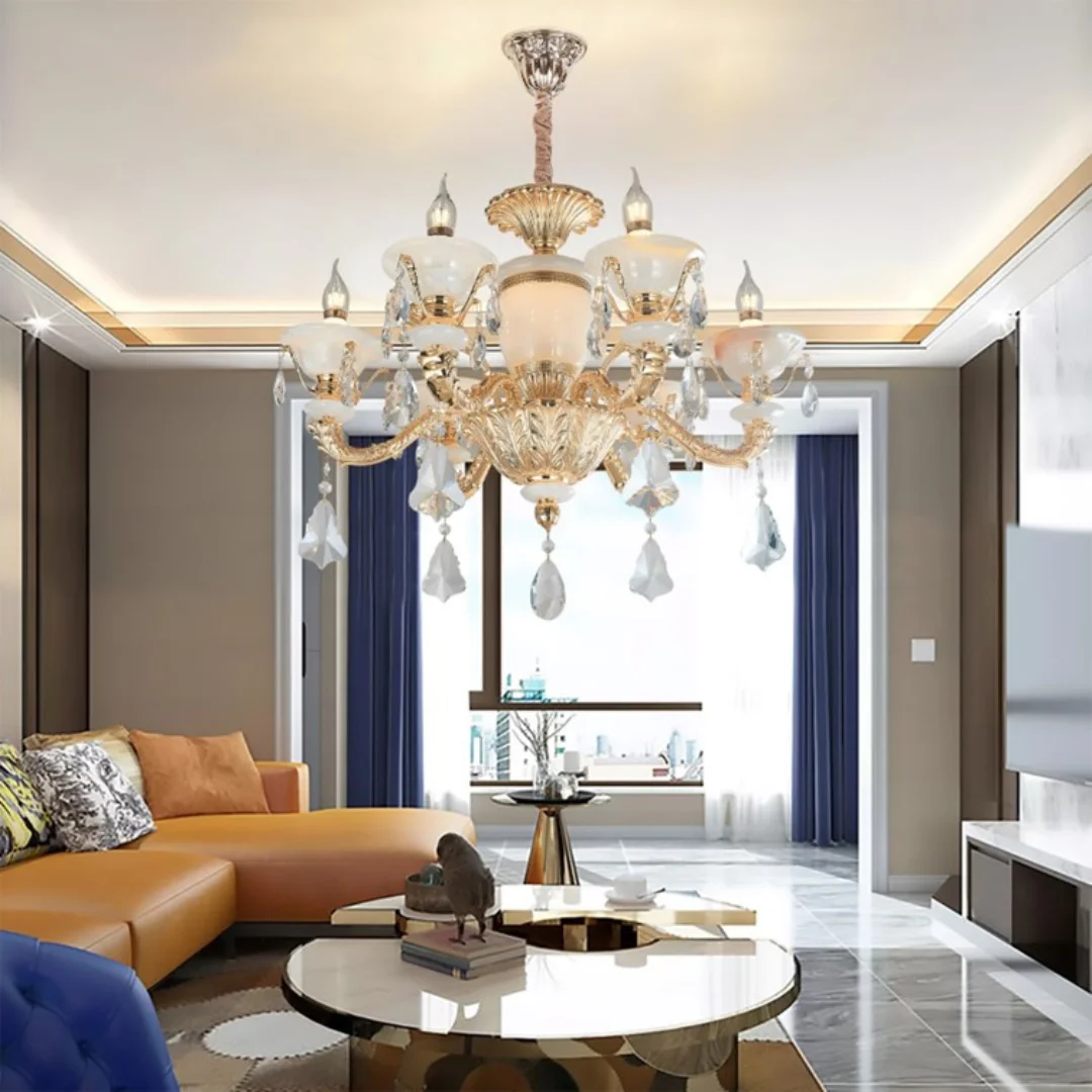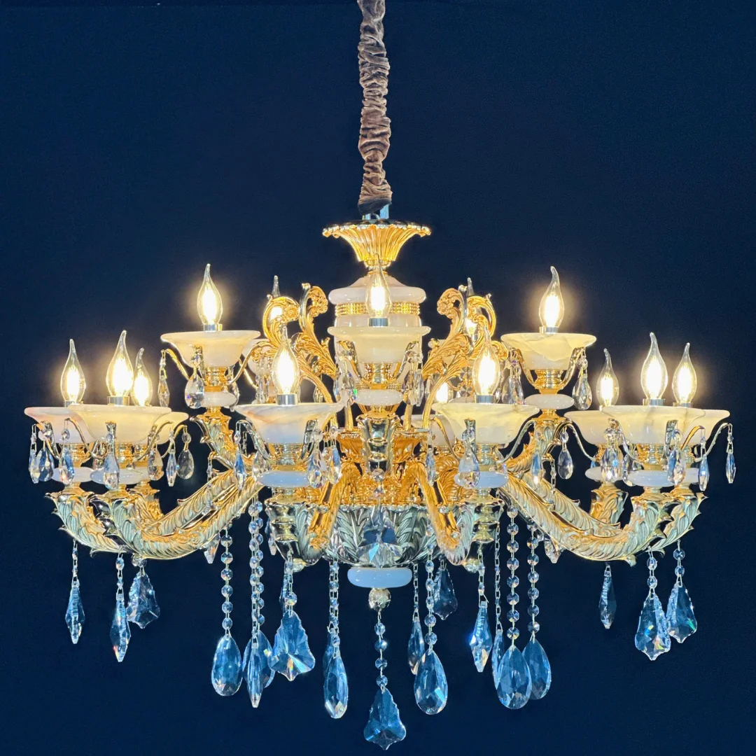 Đèn Chùm Pha Lê DC6239 là mẫu đèn trang trí phù hợp cho phòng khách và sảnh đón cần sự sang trọng, nổi bật nhưng vẫn dễ sử dụng hằng ngày. Thiết kế tông vàng cổ điển phối chao đá trắng sữa, kết hợp pha lê K9 thả giọt tạo hiệu ứng lung linh rõ khi bật đèn. Ánh sáng từ bóng nến E14 giúp không gian ấm áp hơn, đồng thời tôn lên vẻ tinh xảo của chi tiết pha lê. Bạn có thể xem thêm nhiều lựa chọn cùng phong cách tại 127 HOME để chọn đúng kích thước theo diện tích phòng.