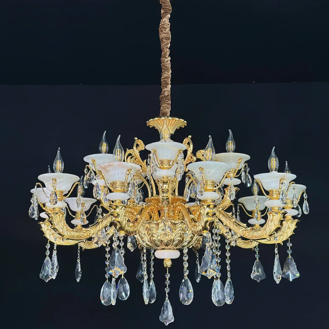 Ánh sáng êm và có chiều sâu: Chao đá làm dịu ánh sáng, pha lê K9 tạo hiệu ứng phản chiếu lấp lánh.