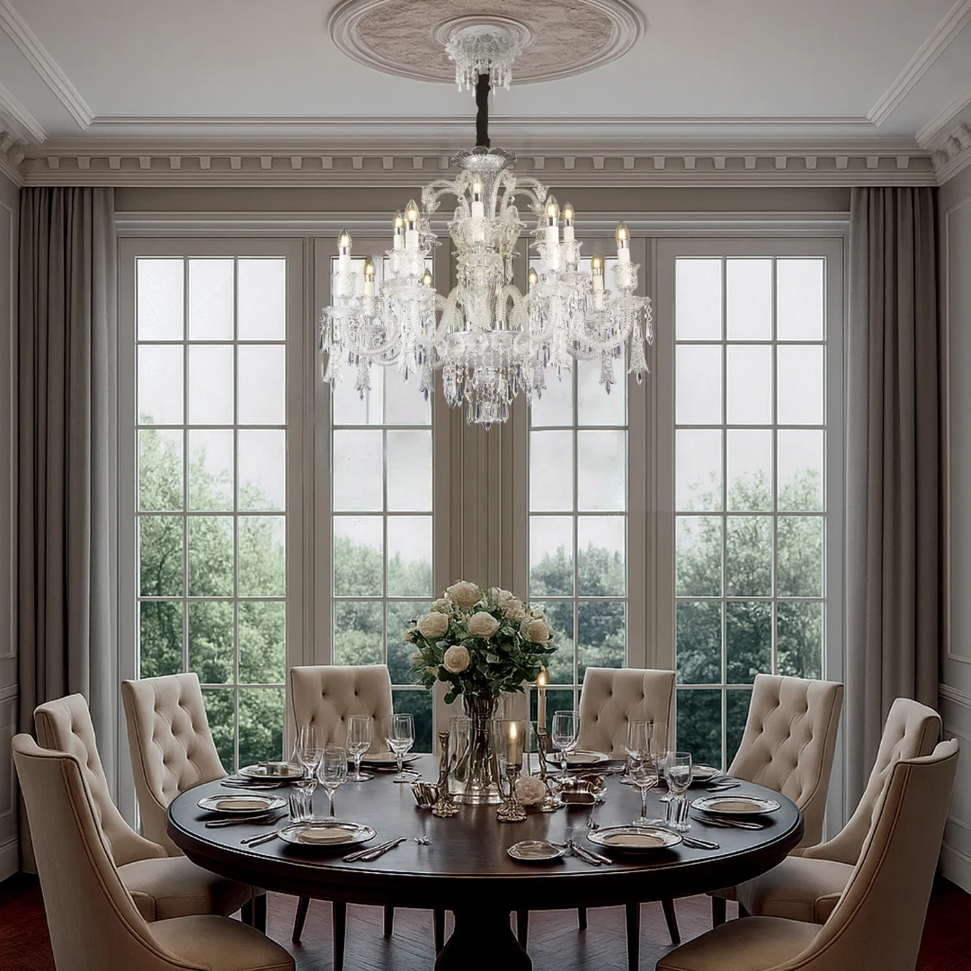 Đèn Chùm Pha Lê DC8806 mang phong cách chùm nến cổ điển đậm chất châu Âu, tạo điểm nhấn sang trọng cho mọi không gian sống. Các mẫu trong dòng như DC8806T18, DC8806T12, DC8806T8, DC8806T6 và DC8806T55 đều được chế tác từ pha lê K9 cao cấp, cho độ trong suốt và phản chiếu ánh sáng rực rỡ. Khung đèn kim loại chắc chắn kết hợp cùng các hạt pha lê tinh xảo giúp ánh sáng tán đều, tạo hiệu ứng lấp lánh cuốn hút.