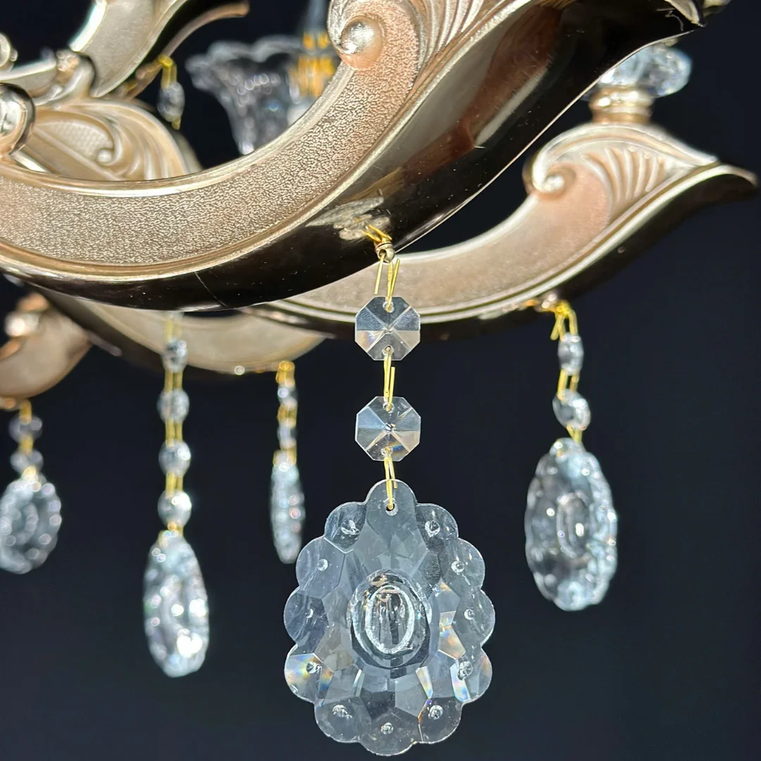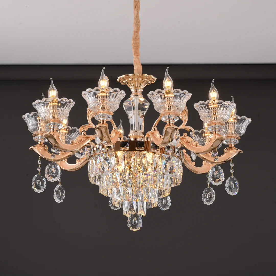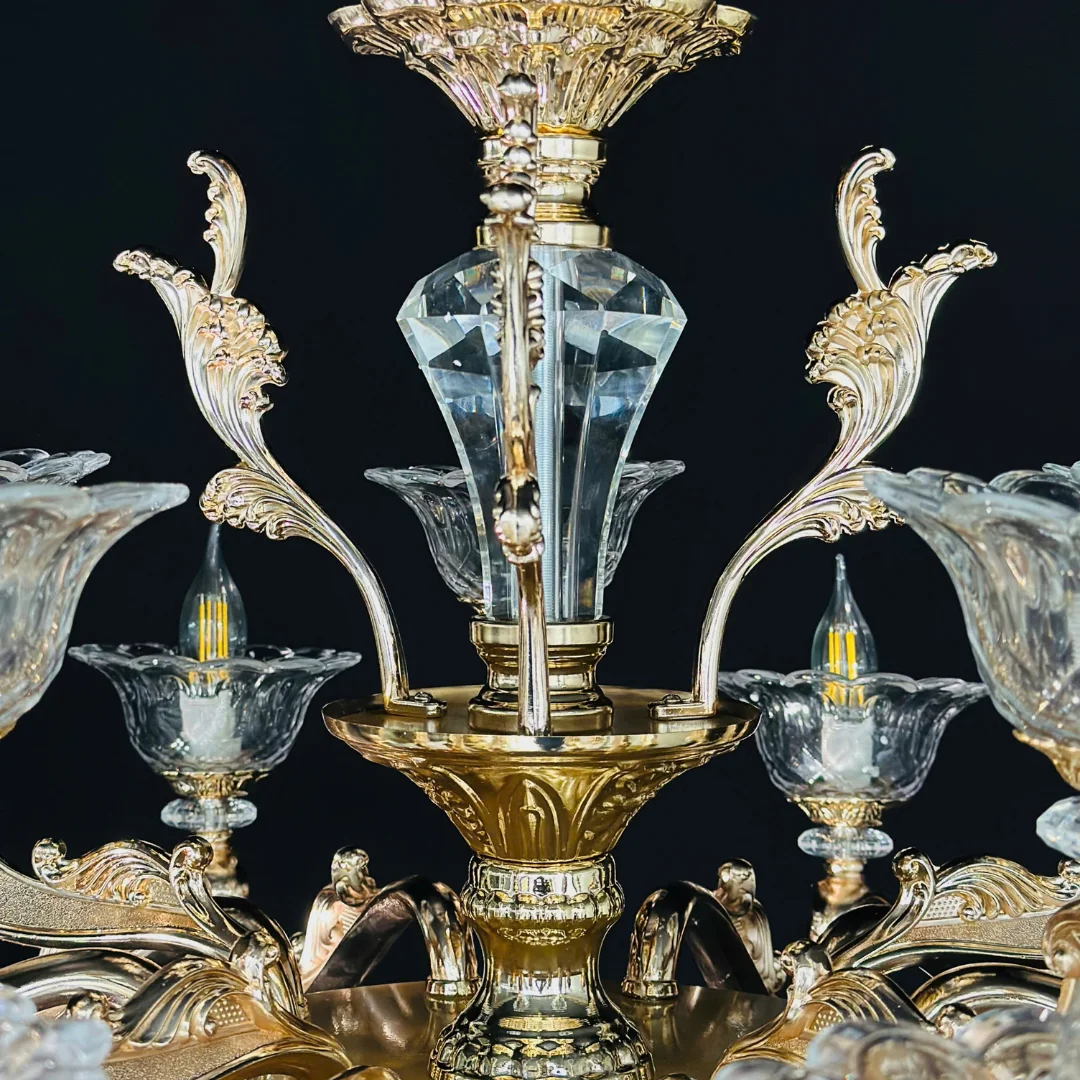 Không gian sang hơn ngay khi lắp: Thiết kế nhiều tay đèn và cụm pha lê tạo điểm nhấn trung tâm rõ rệt.