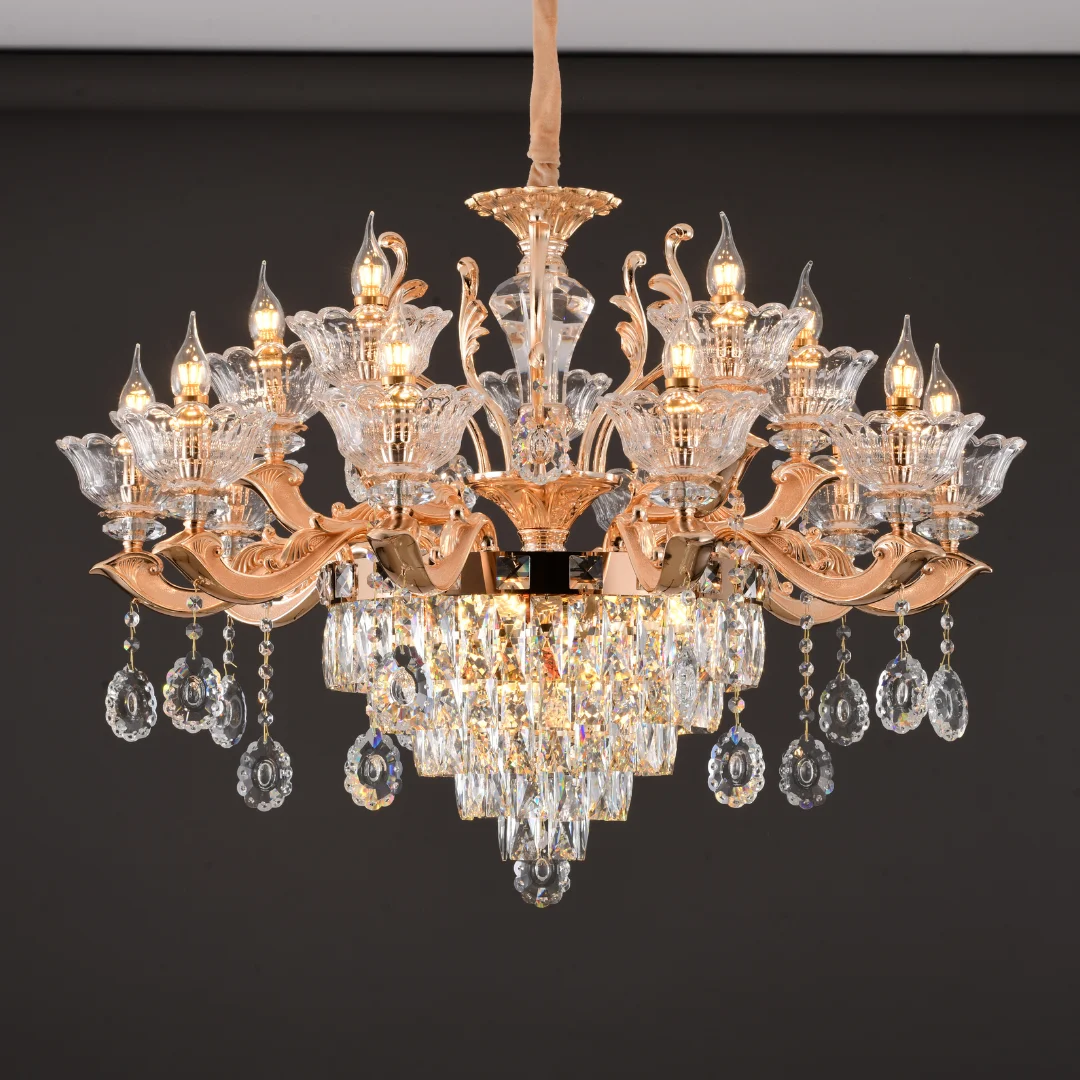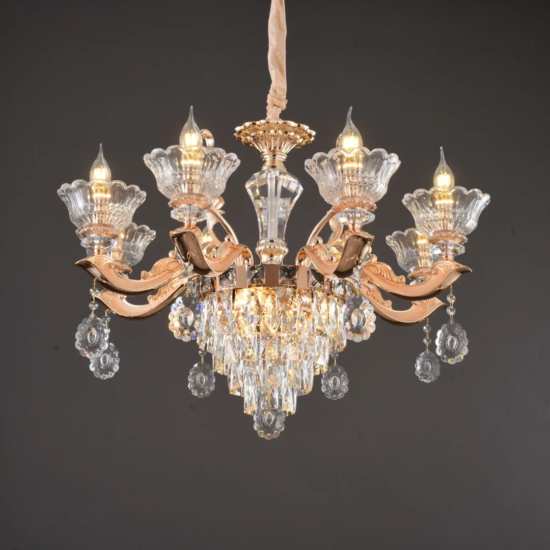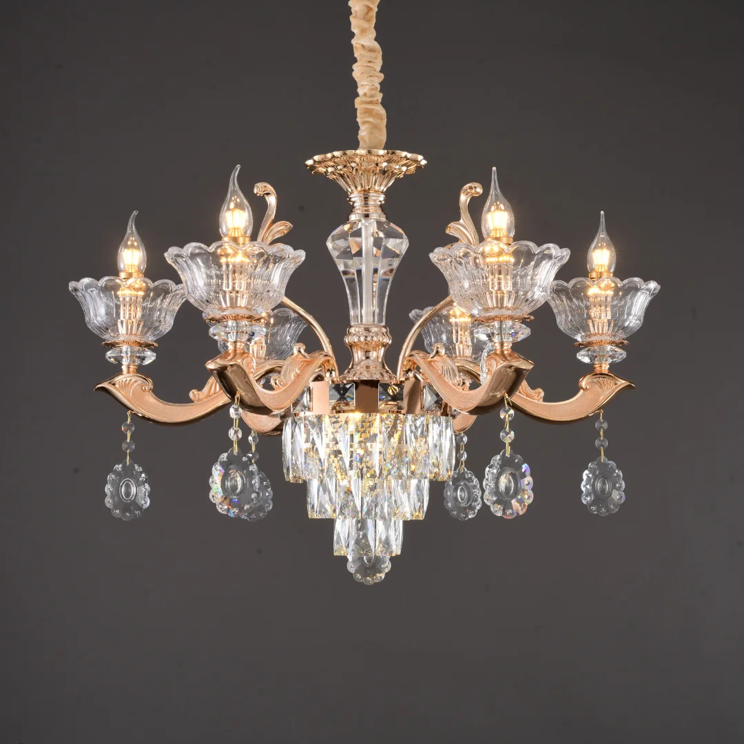 Không gian sang hơn ngay khi lắp: Thiết kế nhiều tay đèn và cụm pha lê tạo điểm nhấn trung tâm rõ rệt.