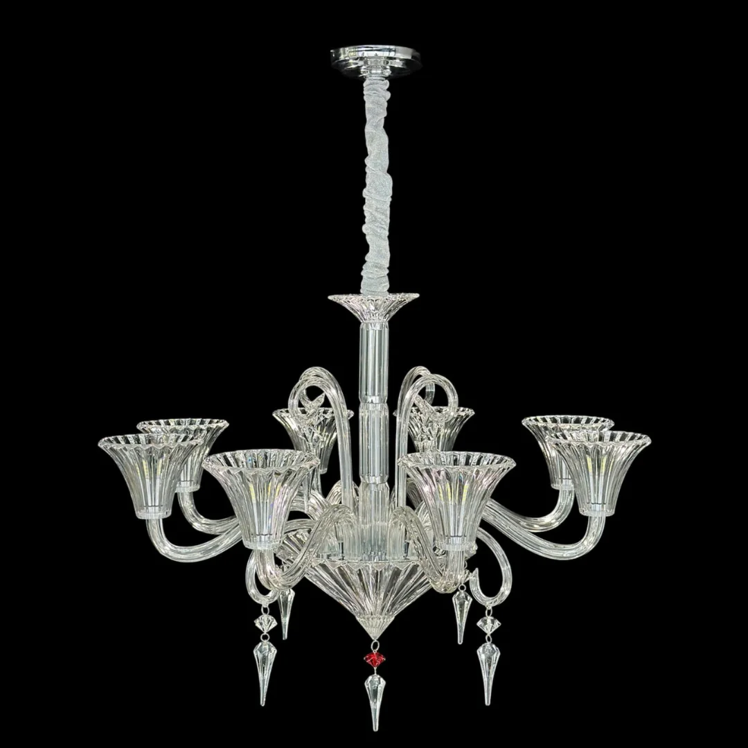 Đèn Chùm Pha Lê DC9008 gây ấn tượng với phong cách sang trọng, nổi bật nhờ chất liệu pha lê trong suốt tạo cảm giác nhẹ và “nịnh” không gian. Phần tay đèn uốn cong mềm mại, mỗi tay đi kèm chao dạng loe tinh tế, giúp ánh sáng hắt lên đẹp và nhìn lung linh hơn khi bật đèn. Ở trung tâm là cụm chao lớn tạo bố cục chắc, làm tổng thể đèn bề thế mà không bị nặng.