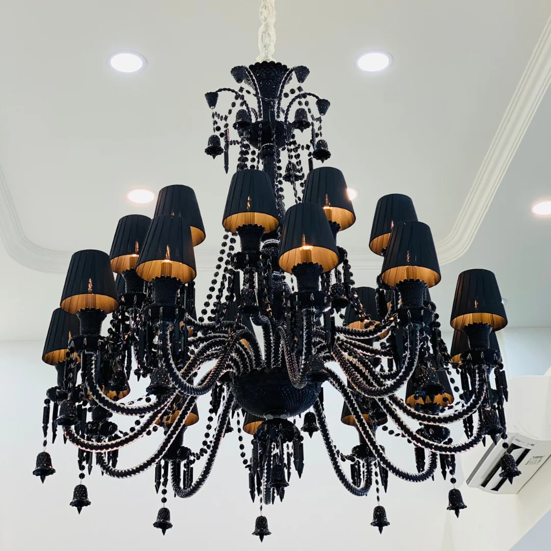 Đèn Chùm Pha Lê DC9809 ĐEN mang phong cách sang trọng đậm chất cao cấp, phù hợp với các không gian cần sự nổi bật như phòng khách lớn, sảnh biệt thự, khu tiếp khách hoặc không gian trưng bày. Tổng thể đèn có bố cục nhiều tầng tay đèn, phân bổ đều quanh thân chính, tạo cảm giác đầy đặn và bề thế. Phần chao đèn màu đen giúp mẫu đèn có chiều sâu thị giác, đặc biệt nổi bật khi đặt trong không gian tông sáng hoặc nội thất hiện đại pha cổ điển.