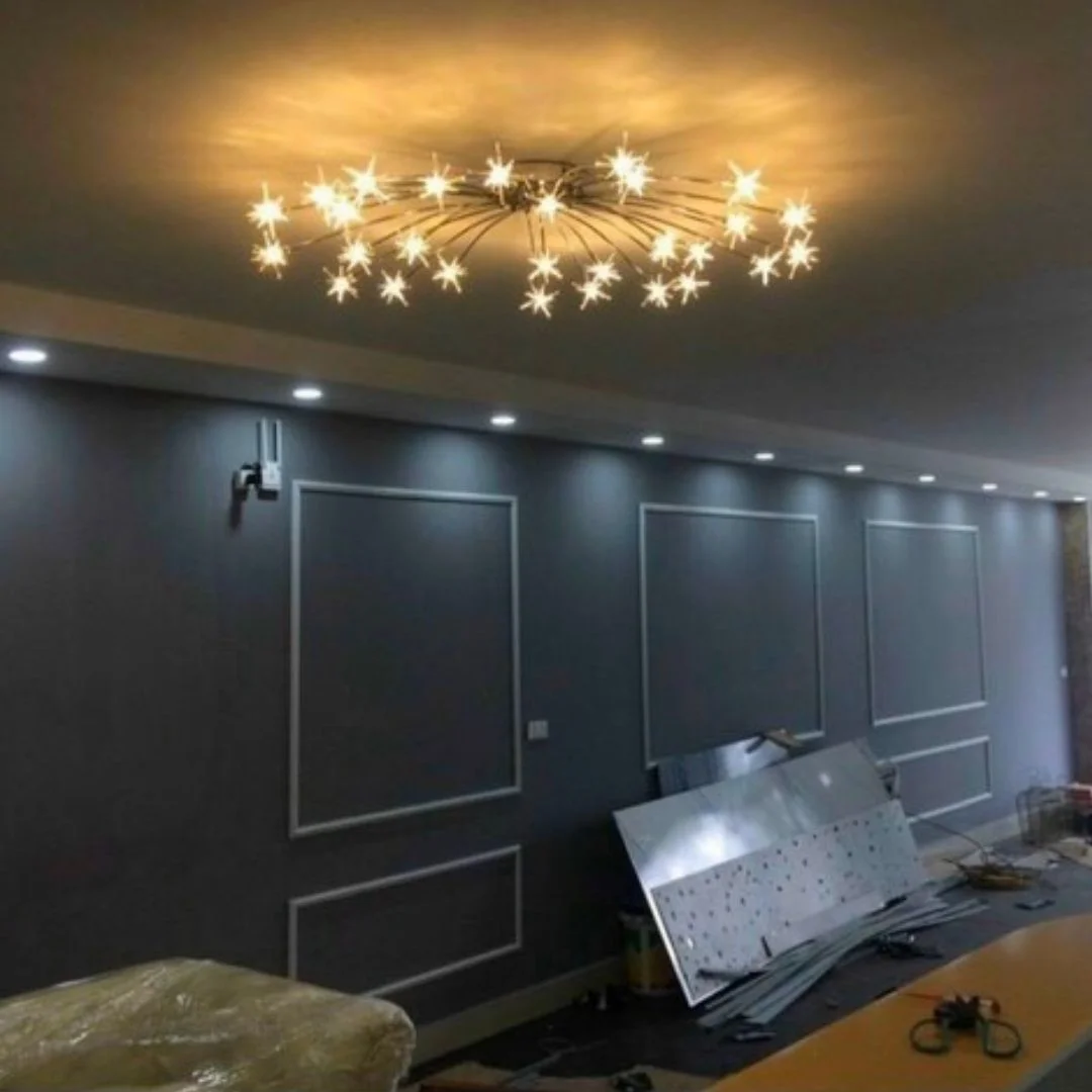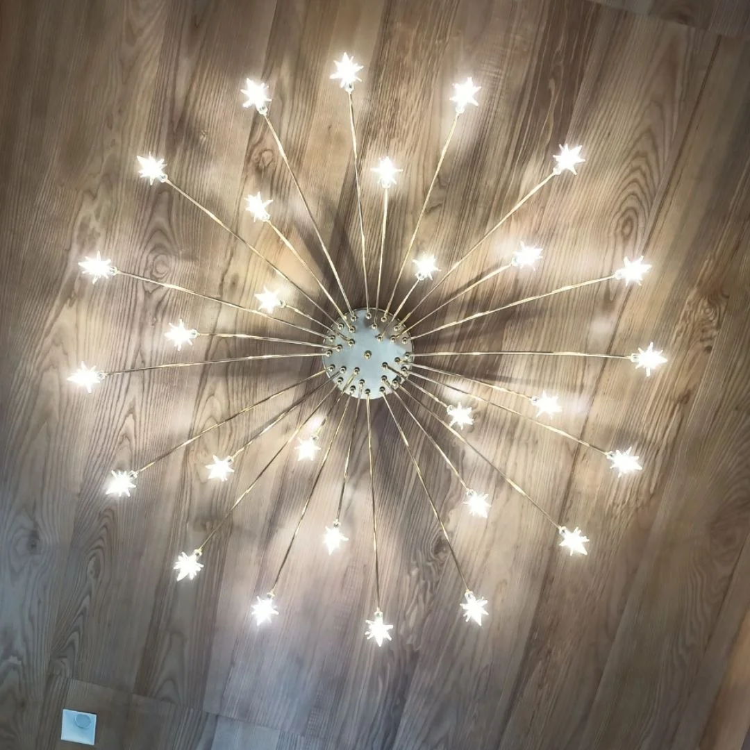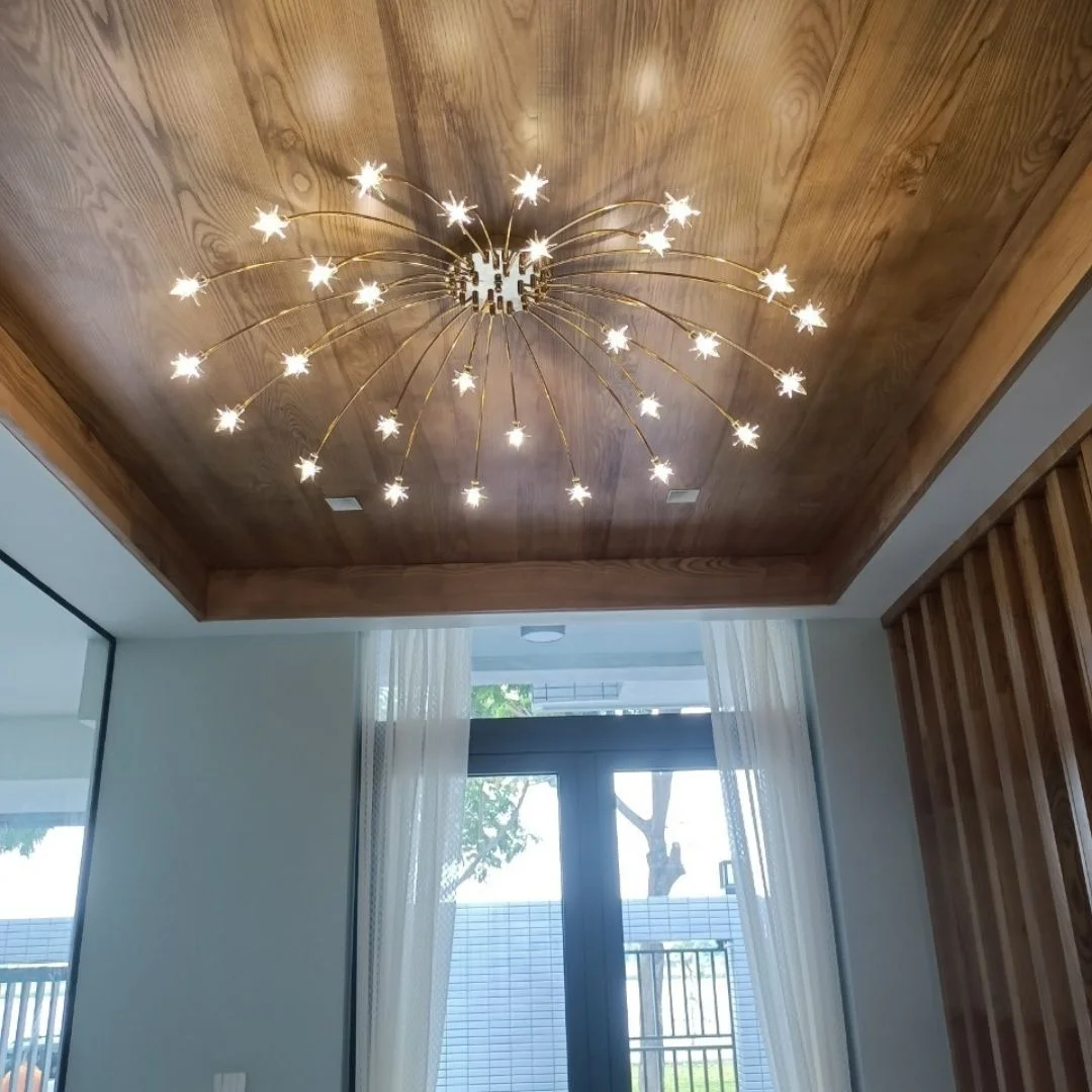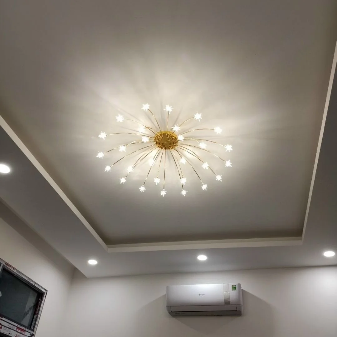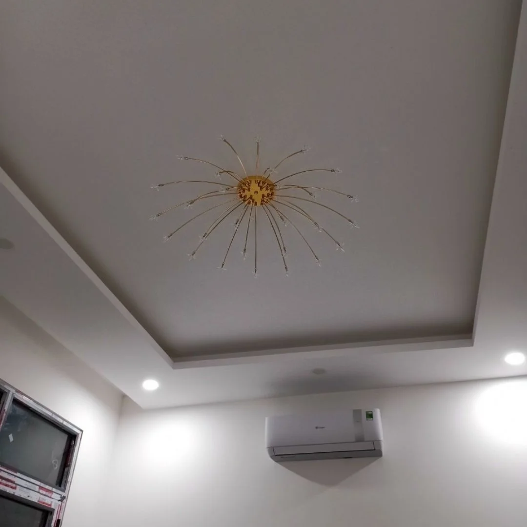 Đèn Ốp Trần Mica OTK25 lấy cảm hứng pháo hoa/tia sao: thân kim loại sơn tĩnh điện vàng champagne uốn cong tỏa tròn, đầu đèn là chụp mica tán quang tạo đốm sáng long lanh. Kết cấu kim loại chắc chắn chống cong vênh, bền màu; mica trong mờ giúp ánh sáng dịu mắt, giảm chói và dễ vệ sinh. Tổng thể mang vẻ hiện đại – sang trọng, phù hợp nhiều phong cách nội thất.