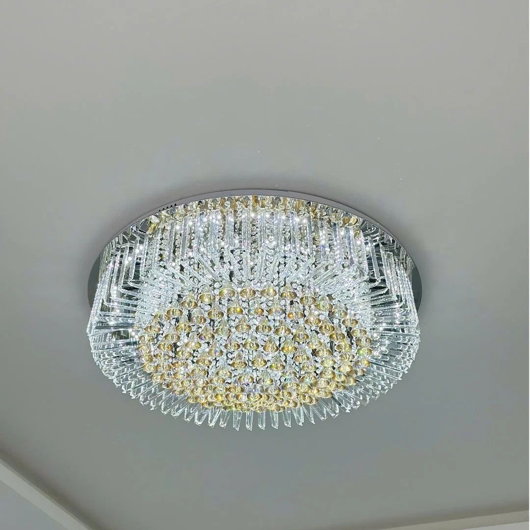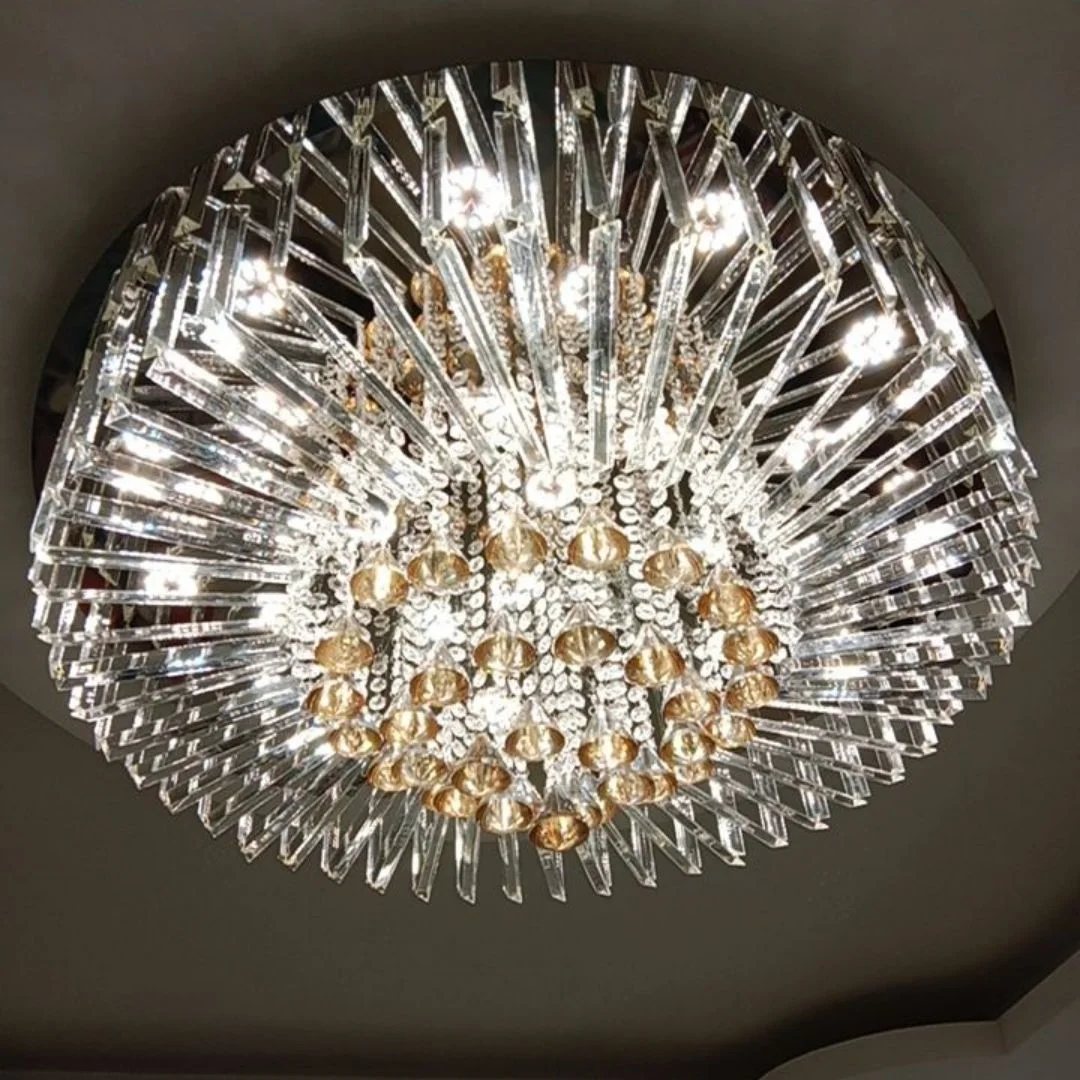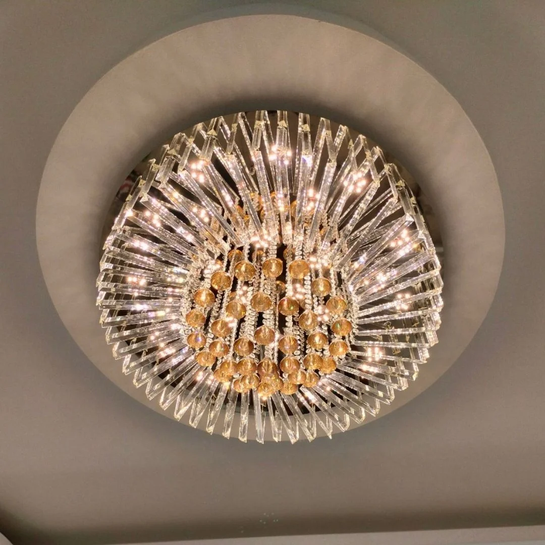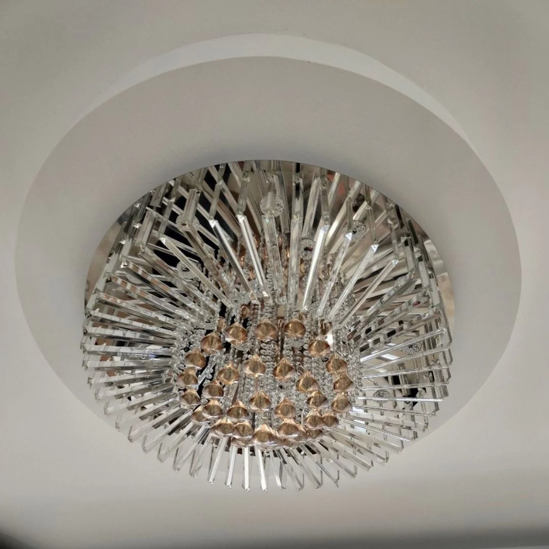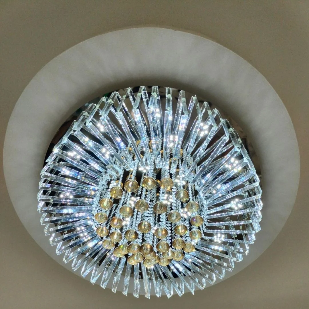 Đèn Ốp Trần Pha Lê OTPL3514 lấy cảm hứng từ thác tinh thể: các thanh pha lê dọc kết hợp lõi pha lê cắt cạnh tạo hiệu ứng “thác sáng” rực rỡ khi bật đèn, mặt ốp tròn bo mềm giúp tổng thể vẫn thanh thoát ở cả size Ø800 và Ø1000. Khung kim loại sơn hoàn thiện chắc chắn, chống cong vênh; pha lê trong suốt phản xạ ánh sáng đẹp mắt, bền màu theo thời gian. Cấu trúc lắp ghép vững chãi cho cảm giác cao cấp và an toàn khi sử dụng.