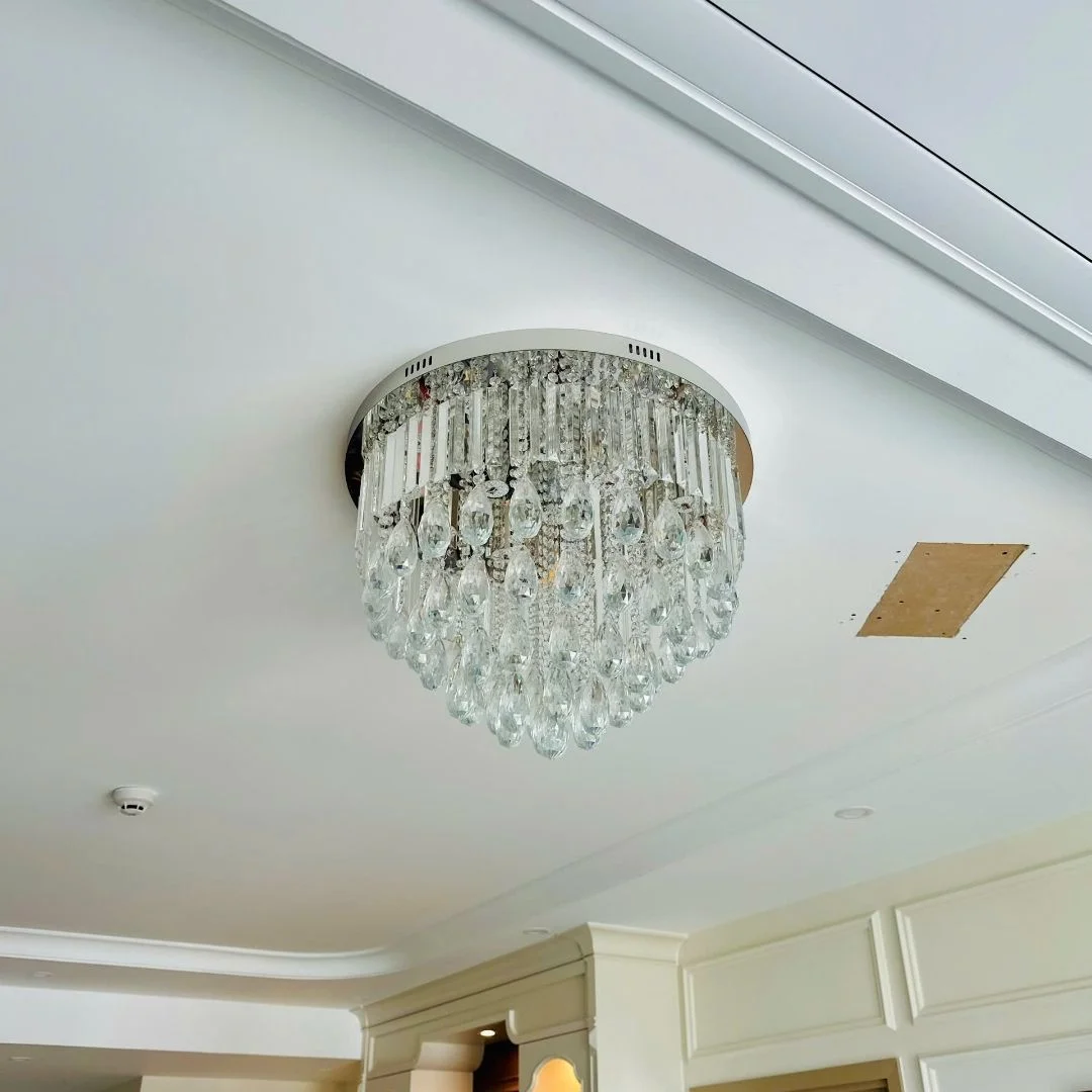 Đèn Ốp Trần Pha Lê OTPL40397 sử dụng form tròn thanh lịch với hai lớp pha lê: viền thanh rơi thẳng đứng bao quanh và chuỗi hạt giọt nước kết tầng bên dưới, tạo hiệu ứng chiều sâu và độ lấp lánh mạnh khi bật đèn. Pha lê K9 trong, cắt giác chuẩn giúp tán xạ ánh sáng đồng đều, hạn chế chói. Khung kim loại mạ bóng/inox gương cho bề mặt sáng, chống oxy hóa, dễ vệ sinh. Hệ LED 3 chế độ cho phép chuyển nhanh tông ấm – trung tính – trắng để phù hợp tiếp khách, ăn tối hay thư giãn; cấu trúc lắp ốp sát trần gọn gàng, tối ưu cho nhiều chiều cao trần.