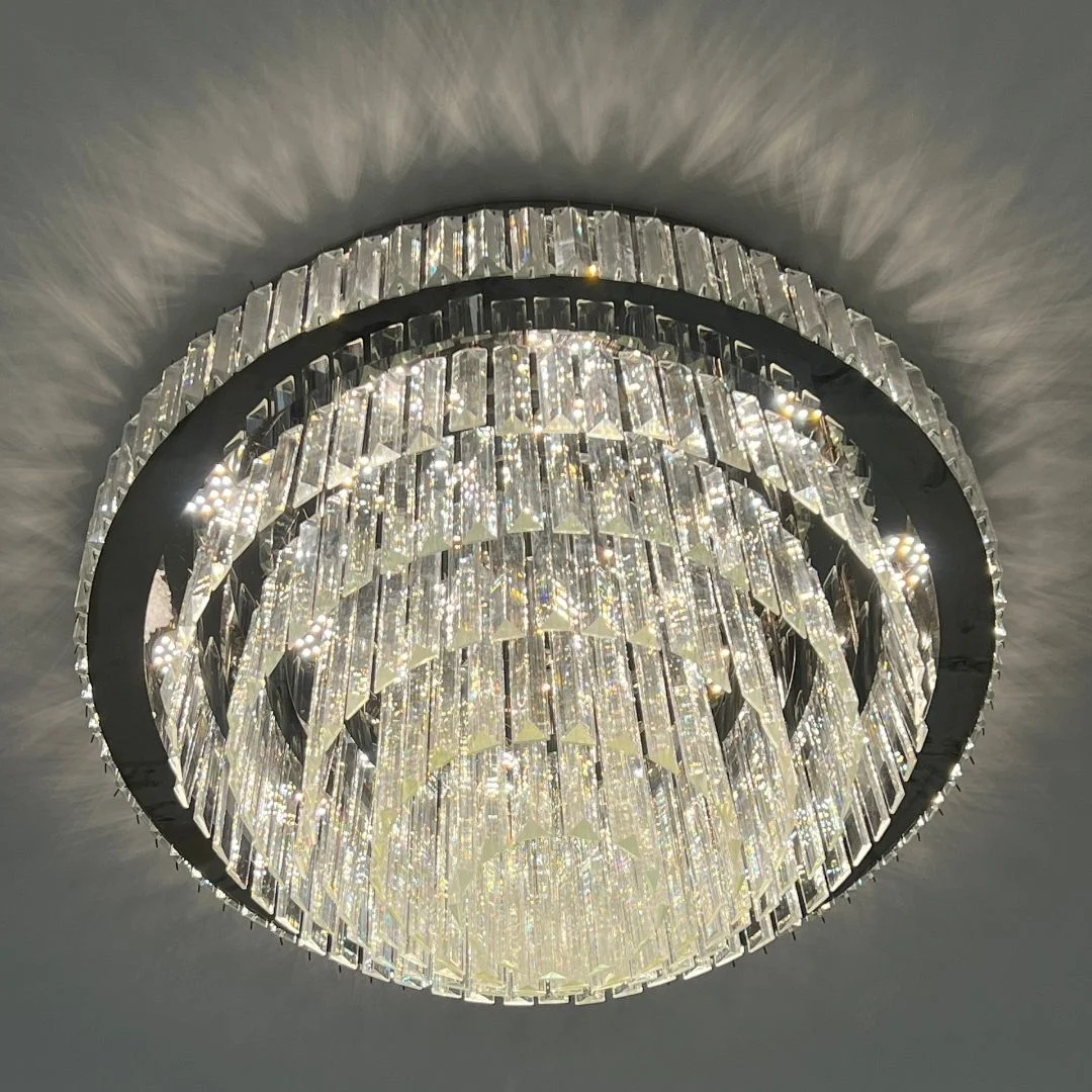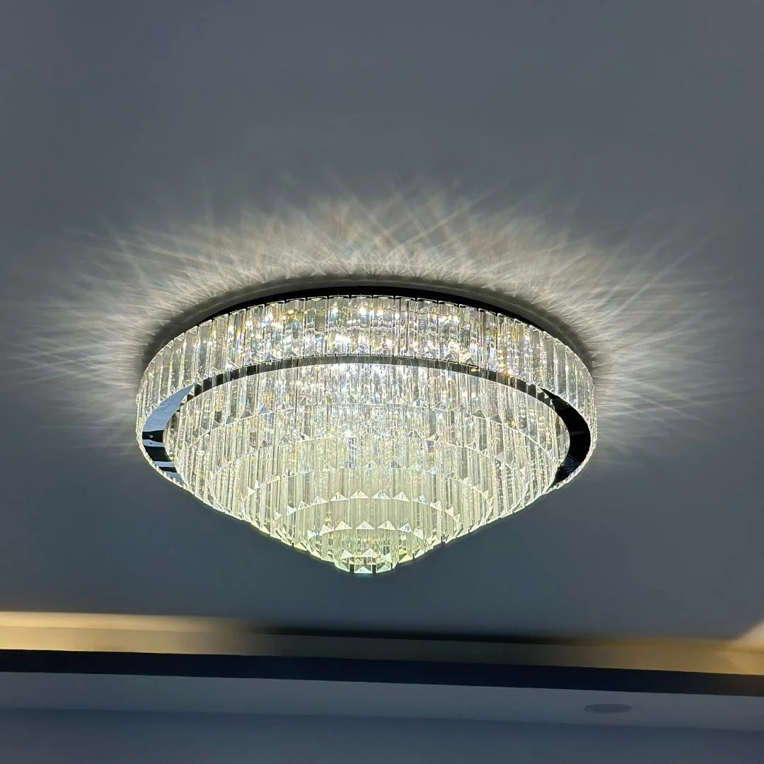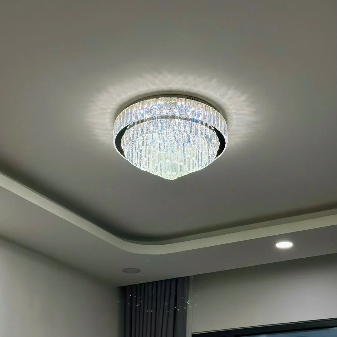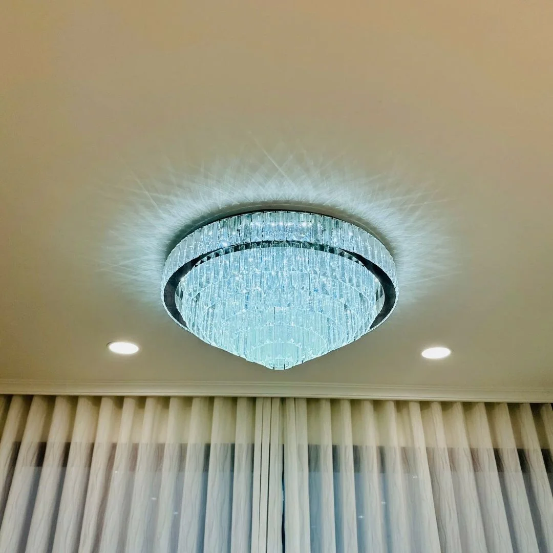 - Pha lê cao cấp phản quang mạnh → không gian rực rỡ, tạo điểm nhấn đẳng cấp cho phòng khách/ sảnh.
