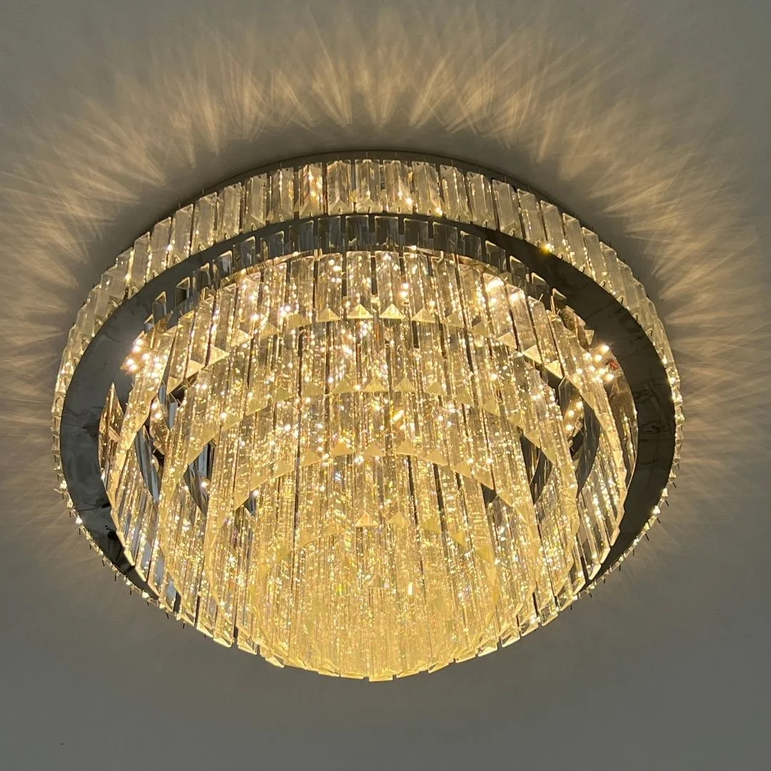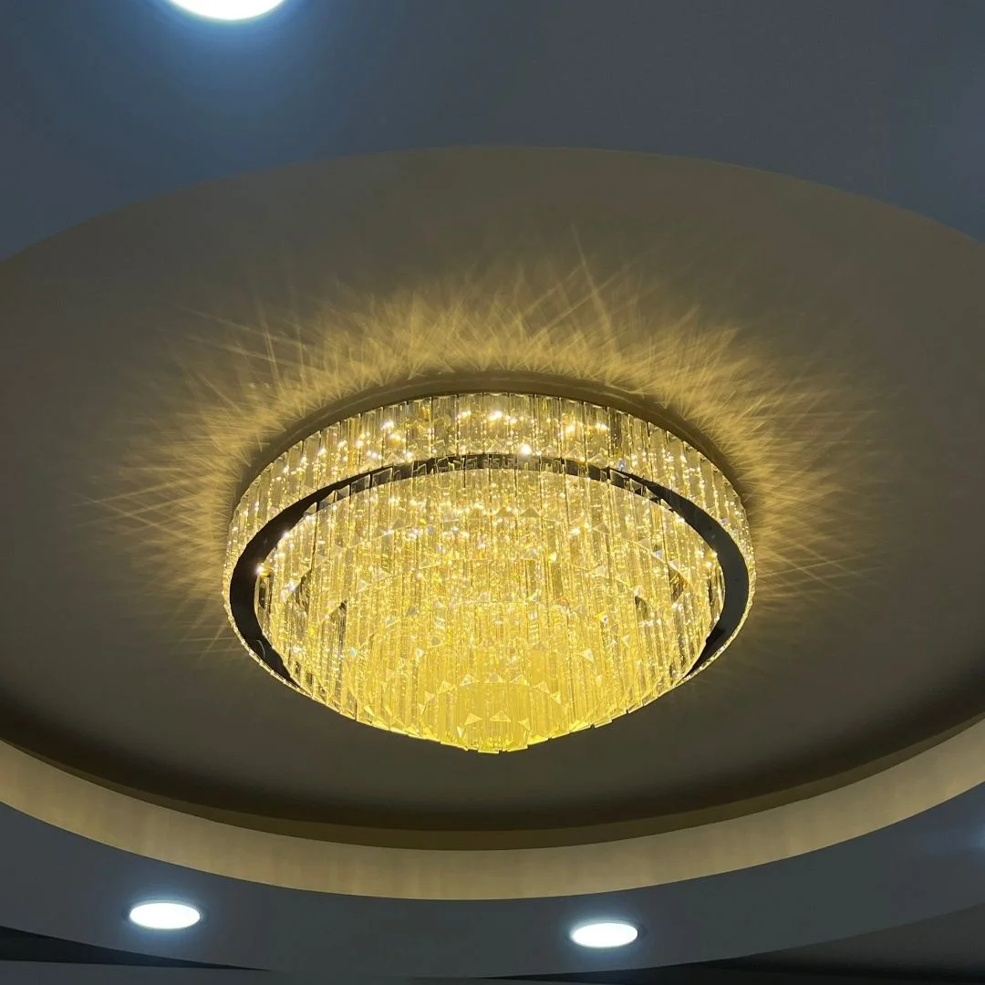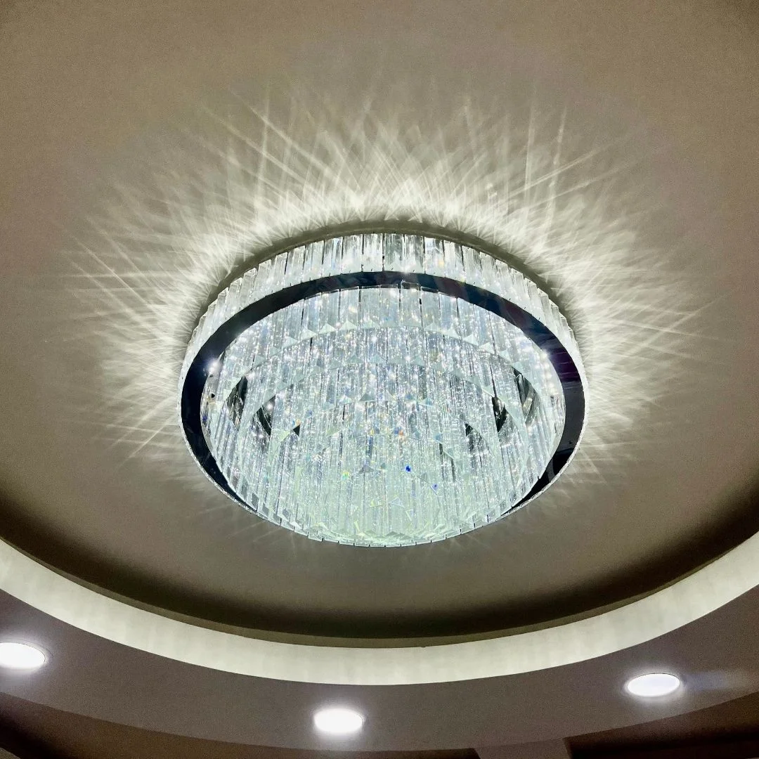 - Pha lê cao cấp phản quang mạnh → không gian rực rỡ, tạo điểm nhấn đẳng cấp cho phòng khách/ sảnh.