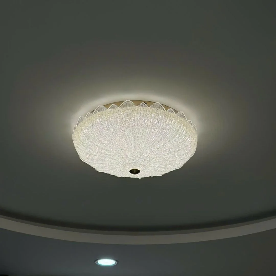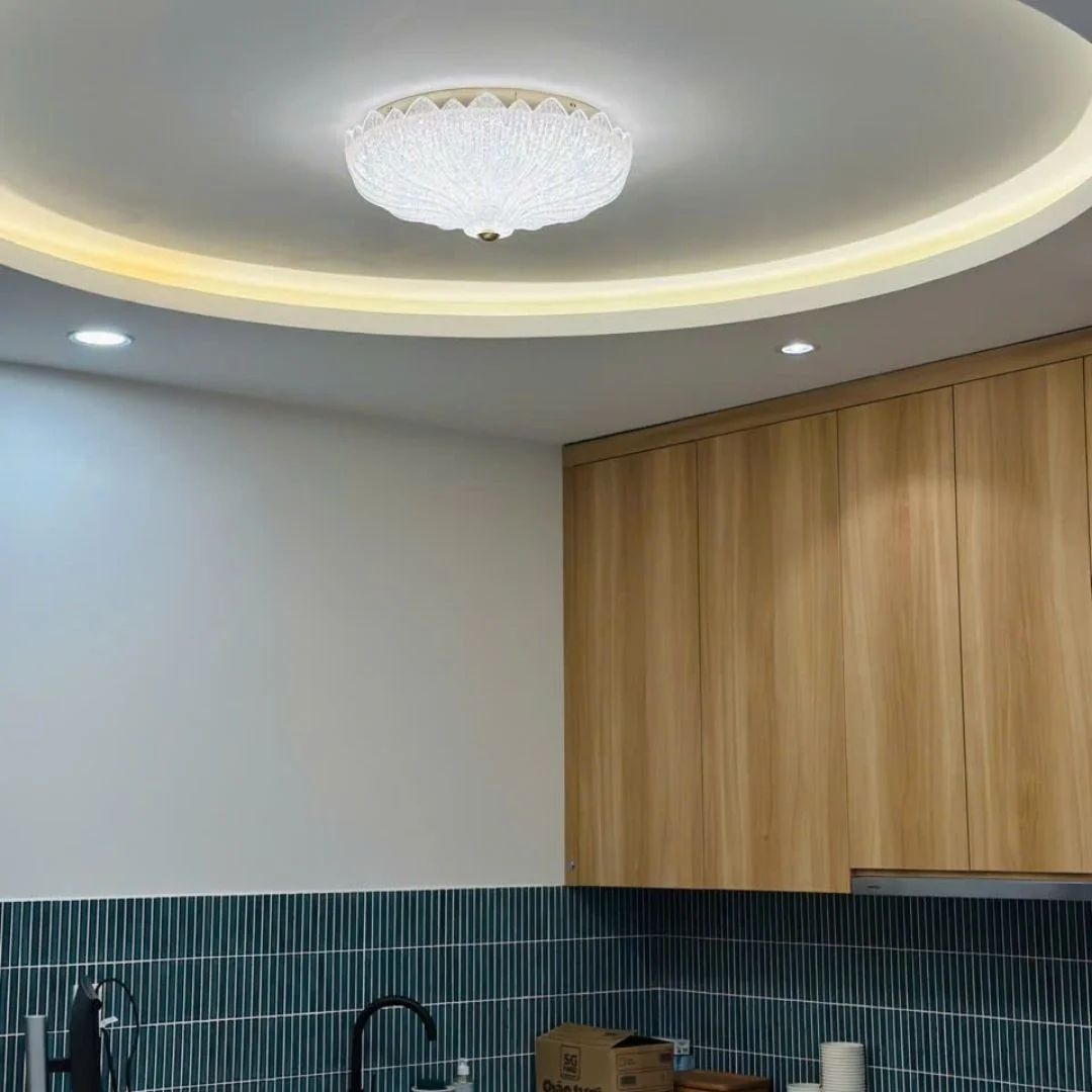 Đèn Ốp Trần Pha Lê OTPL612 có tạo hình tròn Ø500 với chụp pha lê dạng vân tia lan tỏa từ tâm, tạo hiệu ứng lấp lánh như những cánh hoa đang nở; phần viền và đế kim loại chắc chắn ôm gọn khối pha lê, giữ form bền đẹp. Cụm LED 3 chế độ (trắng – trung tính – vàng) cho phép chuyển tông sáng nhanh theo bối cảnh sinh hoạt, vừa thẩm mỹ vừa tiết kiệm điện.