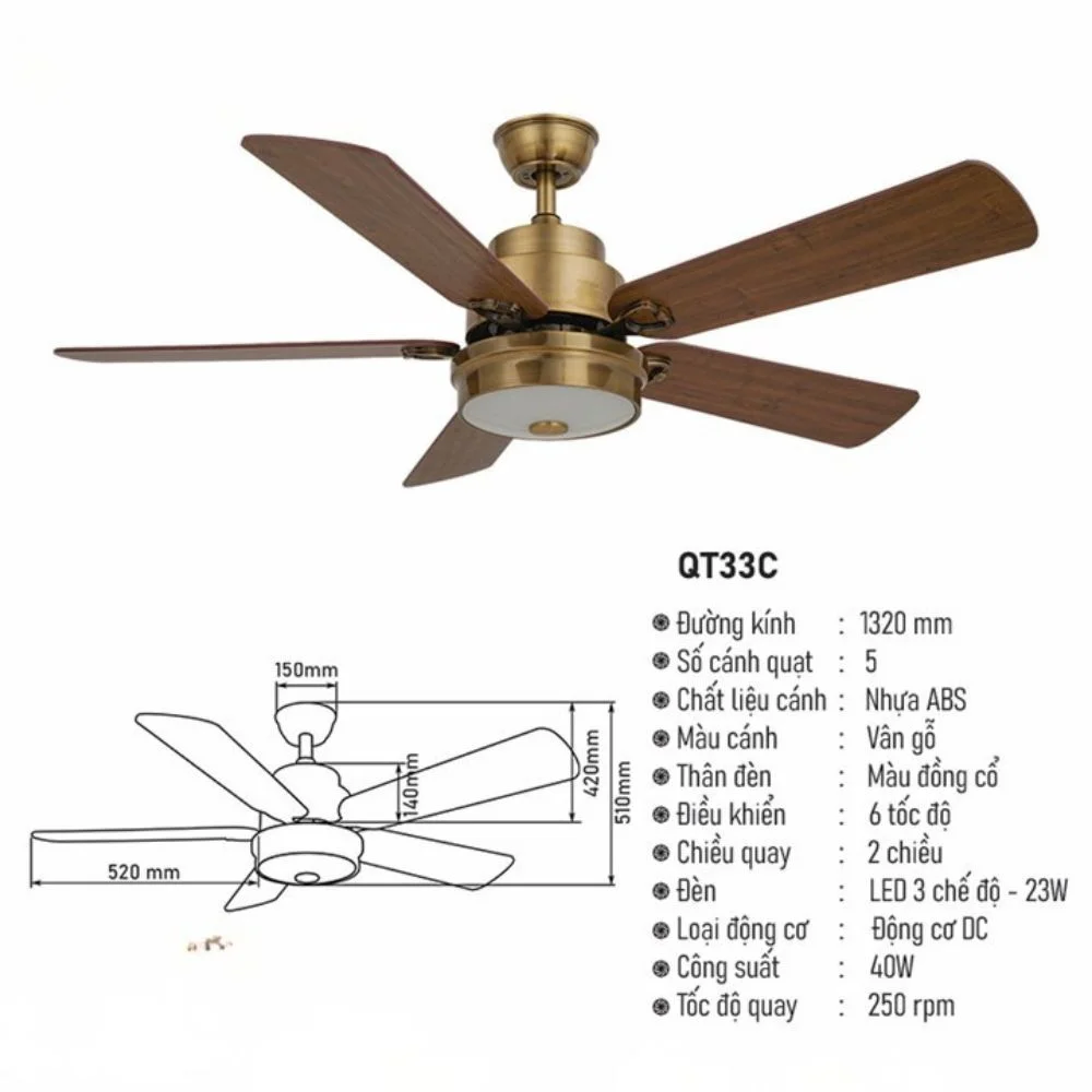 Đèn Quạt Trần Acry QT33 là một trong những mẫu quạt trần cao cấp được nhiều gia đình Việt lựa chọn nhờ sự kết hợp hoàn hảo giữa tính năng làm mát và giá trị thẩm mỹ. Với thiết kế 5 cánh gỗ nhựa ABS vân gỗ tự nhiên, kết hợp cùng thân đèn màu đồng cổ sang trọng, sản phẩm không chỉ mang đến làn gió mát lành mà còn là một điểm nhấn ấn tượng cho không gian sống. Đặc biệt, dòng quạt này tích hợp đèn LED 3 chế độ hiện đại, dễ dàng điều chỉnh bằng remote, phù hợp cả phòng khách, phòng ngủ hay căn hộ chung cư.
