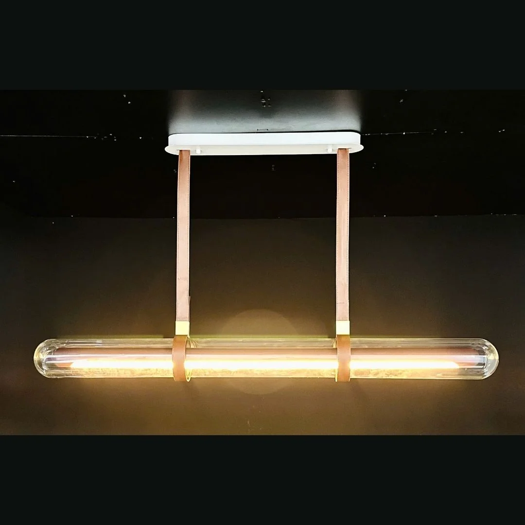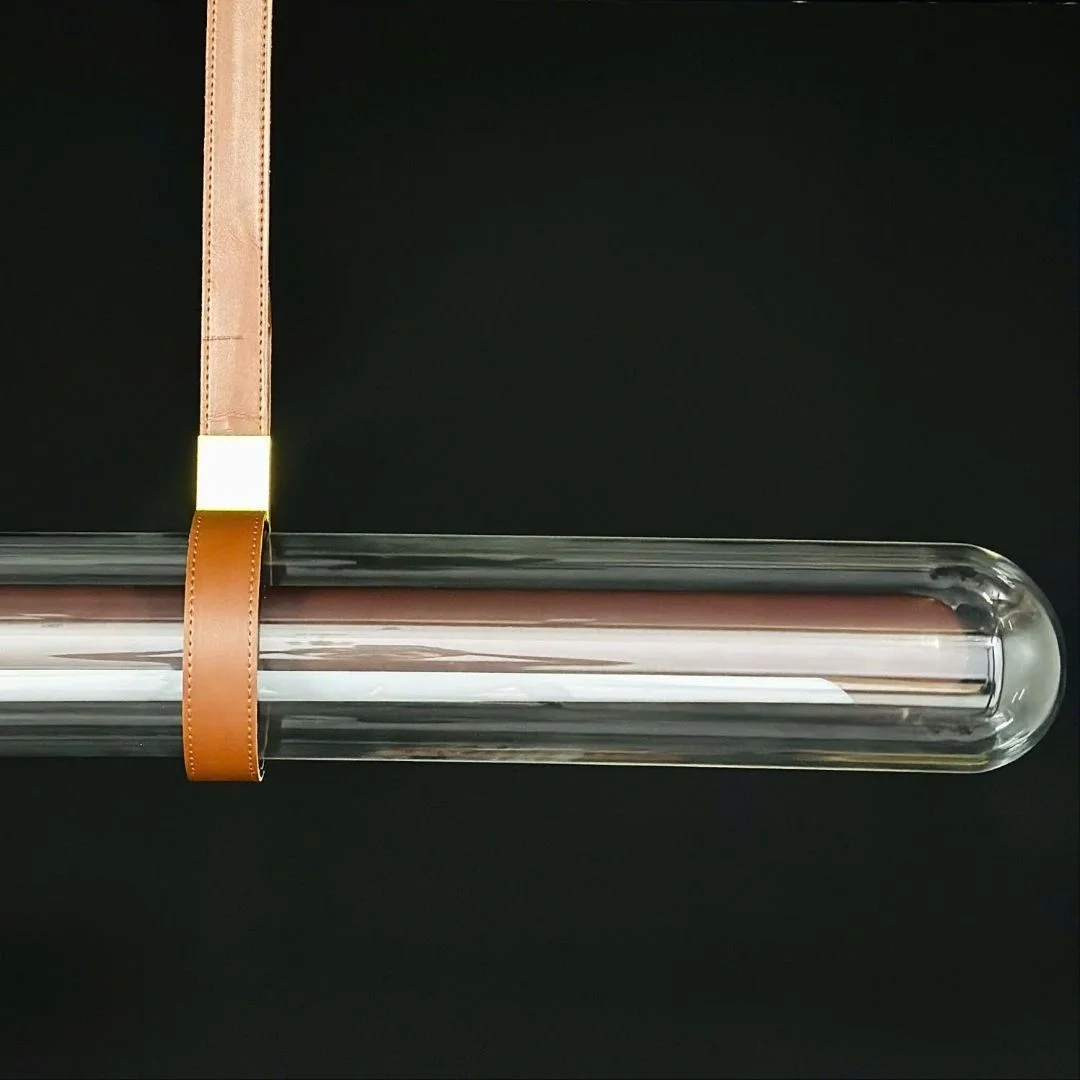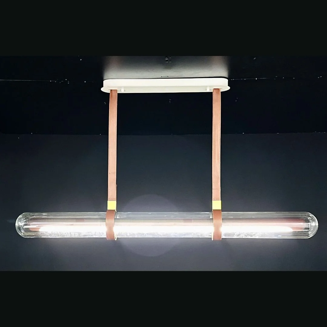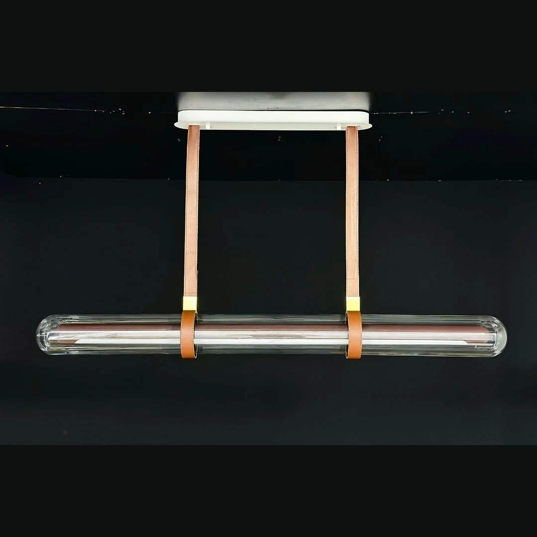 Đèn Thả Hiện Đại THD41 được thiết kế dạng ống dài 1,35 m, hai đầu bo tròn mềm mại, tạo cảm giác thanh thoát khi treo lơ lửng trên không. Thân ống được treo bằng hai đai da giả màu nâu gắn vào bản đế kim loại trên trần, khiến chiếc đèn giống như một thanh sáng được “đỡ” bằng dây da rất cá tính. Khi bật sáng, dải LED bên trong tỏa ánh sáng dọc theo thân ống, phản chiếu qua lớp mica trong, tạo hiệu ứng ánh sáng đều và sang trọng trên toàn bộ khu vực bàn phía dưới.