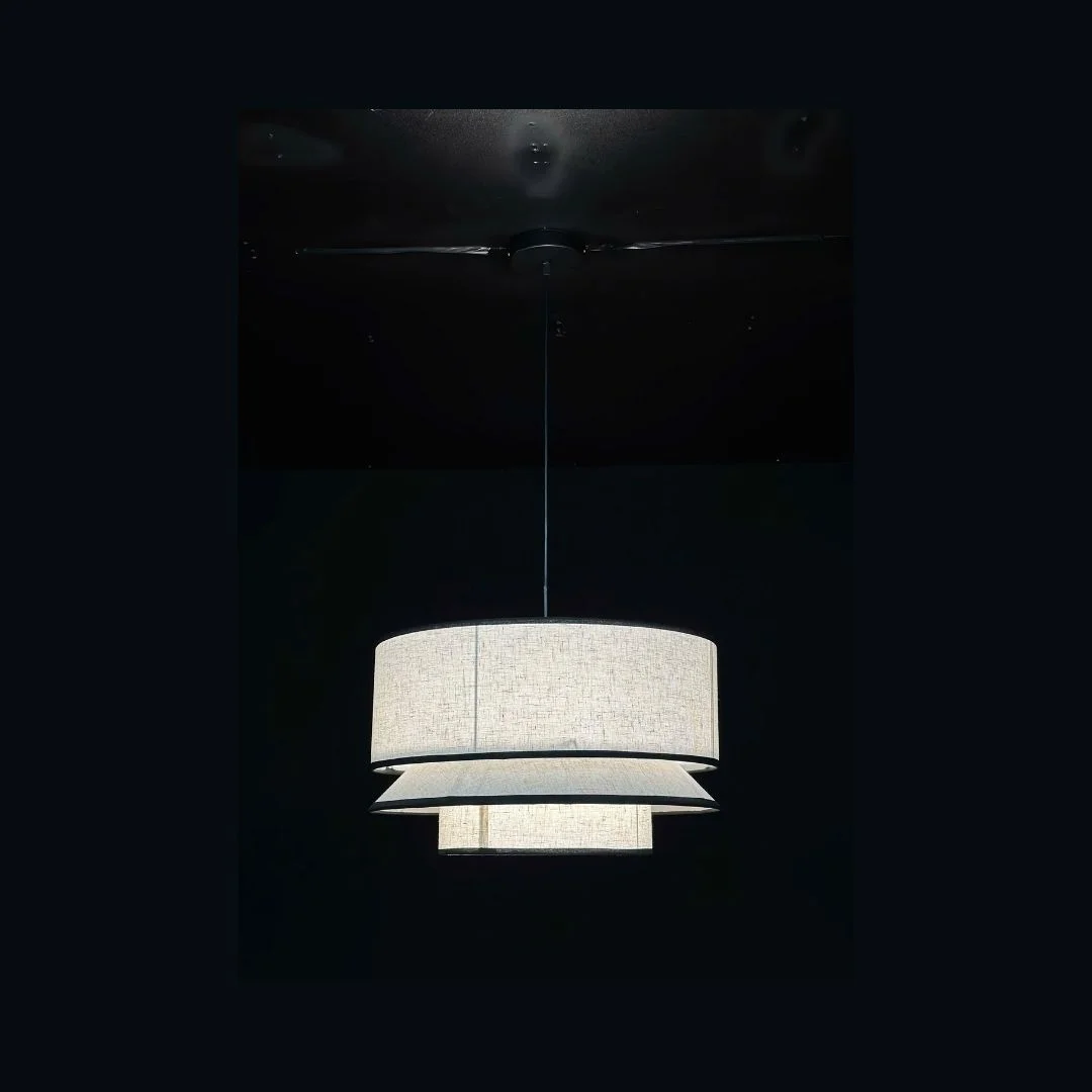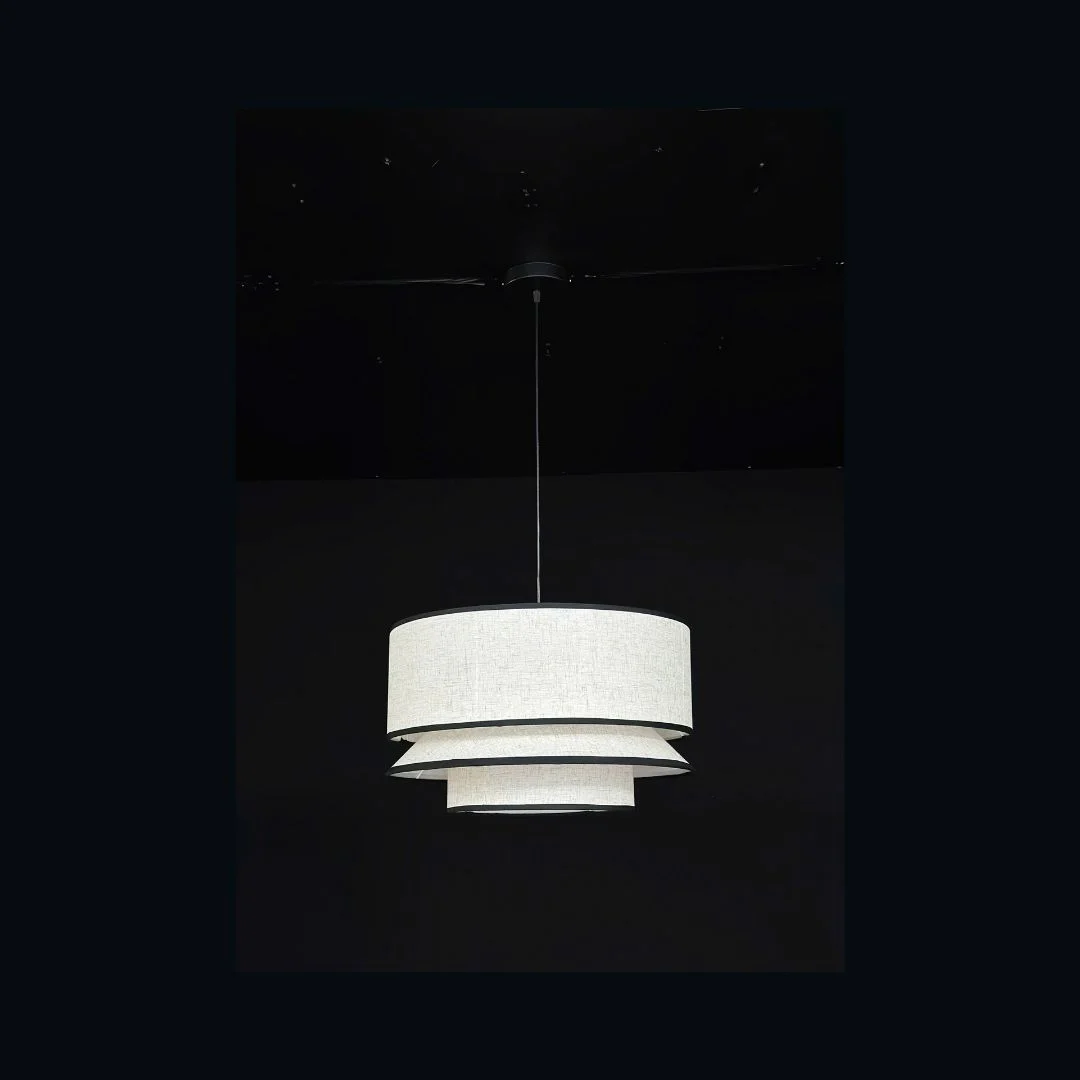 Đèn Thả Hiện Đại THD53 gây ấn tượng với thiết kế chao vải 3 tầng hình tròn, xếp lớp từ lớn đến nhỏ tạo cảm giác như một chiếc váy xếp ly mềm mại treo trên trần. Màu vải sáng trung tính kết hợp với đường viền đen mảnh chạy quanh mép chao giúp tổng thể đèn vừa nhẹ nhàng vừa có điểm nhấn rõ ràng. Khi bật sáng, ánh sáng từ 2 bóng E14 tỏa ra xuyên qua từng lớp vải, tạo nên hiệu ứng ánh sáng tầng sâu rất đẹp, phù hợp làm đèn chính cho bàn ăn hoặc đèn trang trí cho phòng khách.