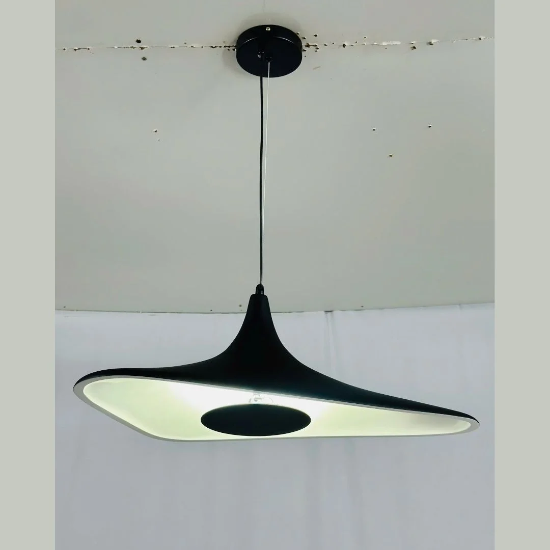 Đèn Thả Hiện Đại THD55 gây ấn tượng với phần chao đèn dạng bản mỏng, uốn cong mềm như một cánh chim đang sải rộng. Từ trần nhà, dây thả mảnh nối xuống thân đèn nhỏ gọn, sau đó loe ra thành mặt đèn rộng 580 mm, tạo cảm giác lơ lửng đầy nghệ thuật. Bề mặt ngoài màu đen nhám, phía trong màu sáng giúp ánh sáng phản xạ tốt hơn. Khi bật lên, ánh sáng LED hắt đều trên toàn bộ mặt chao, tạo hiệu ứng rất đẹp mắt trên bàn ăn hoặc mặt bàn phía dưới.