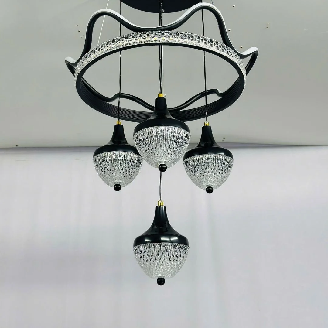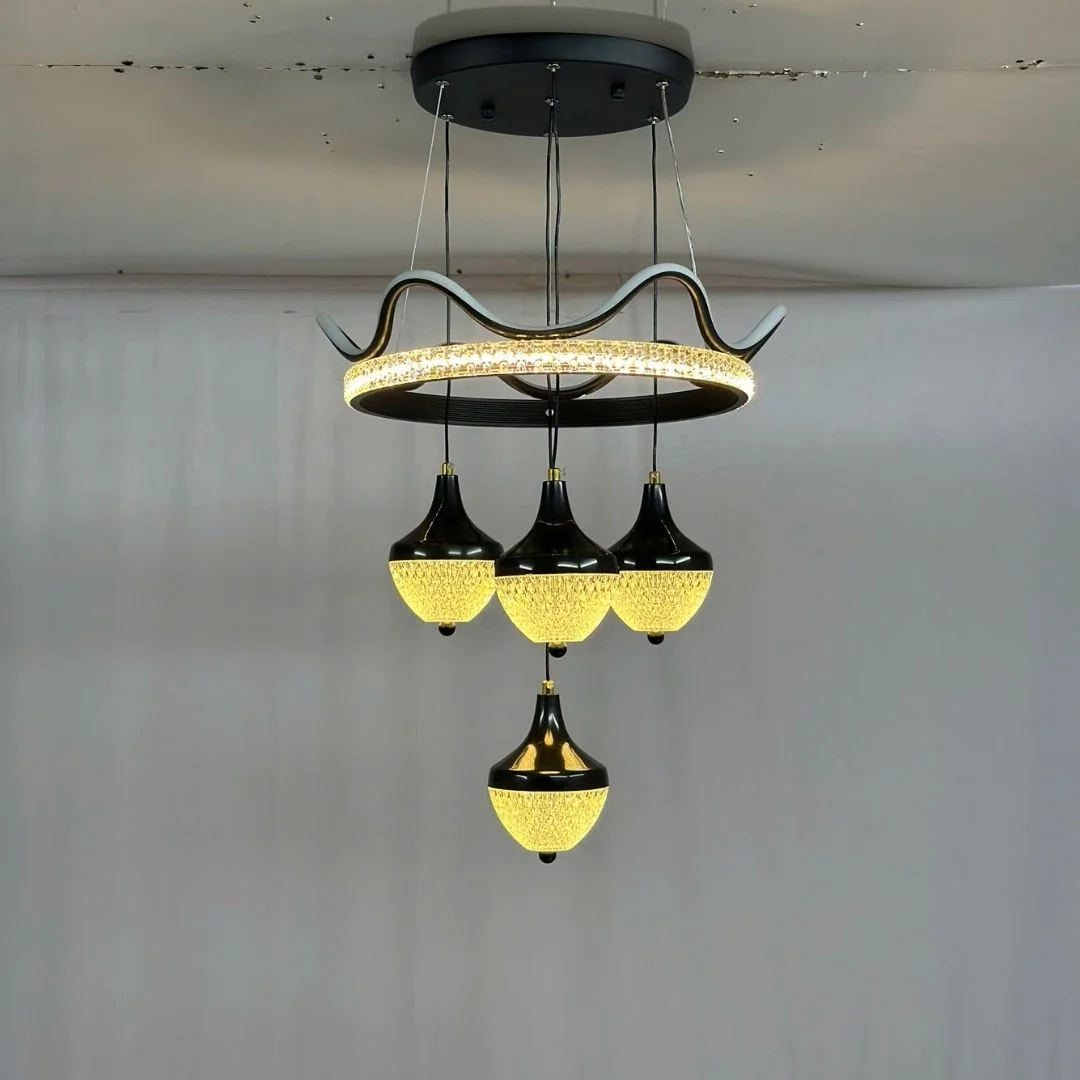 Đèn Thả Hiện Đại THDBA06 có thiết kế hình dáng độc đáo và tinh tế. Phần đèn chính được cấu tạo từ một vòng tròn lớn, uốn cong như sóng nước, tạo nên một vẻ đẹp hiện đại và thanh thoát. Các bóng đèn nhỏ được treo lơ lửng tạo nên một tổng thể hài hòa và bắt mắt. Sản phẩm mang màu đen chủ đạo kết hợp với ánh sáng vàng nhẹ, tạo nên không gian ấm cúng và sang trọng.