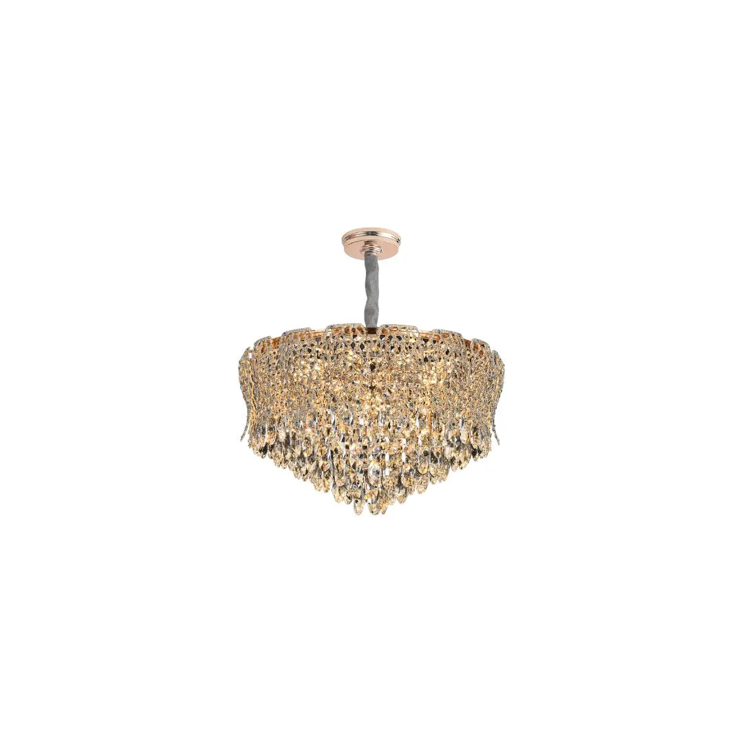 TPL158 có kiểu dáng tán tròn thấp, phần thân đèn không kéo dài nên tạo cảm giác gọn và chắc. Nhìn từ xa, các lớp pha lê rũ dày tạo thành một khối tròn mềm mại, khi bật đèn ánh sáng lan tỏa đều và phản chiếu lấp lánh ở nhiều góc nhìn. Tông kim loại sáng kết hợp ánh pha lê giúp tổng thể sang trọng, phù hợp phòng khách, phòng ăn hoặc sảnh nhỏ cần điểm nhấn.