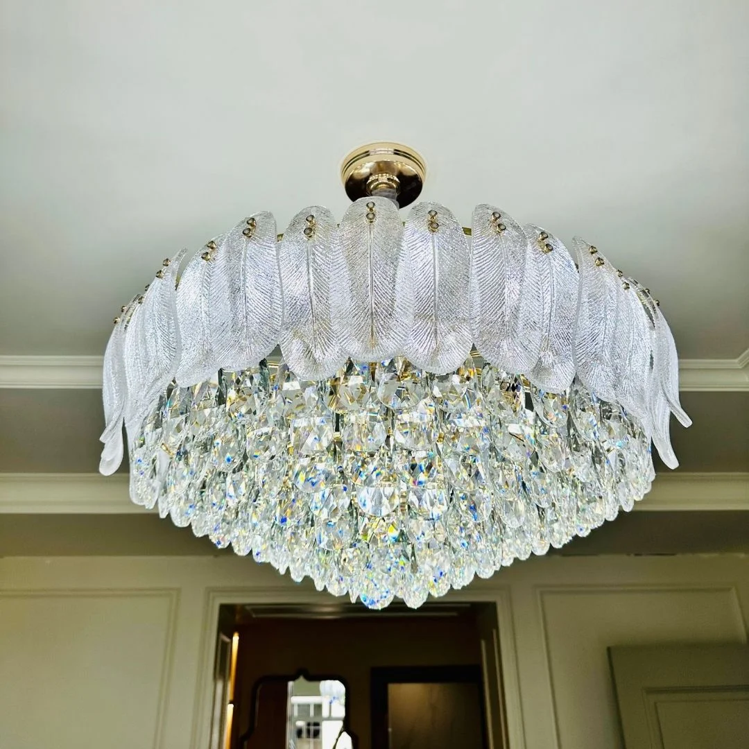 • Hiệu ứng pha lê lấp lánh giúp không gian trông sang hơn, tạo điểm nhấn rõ rệt cho phòng khách và bàn ăn.