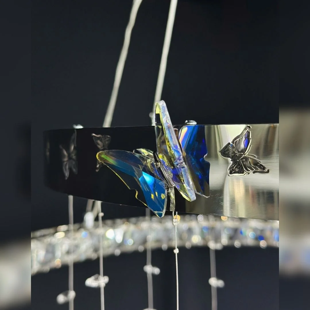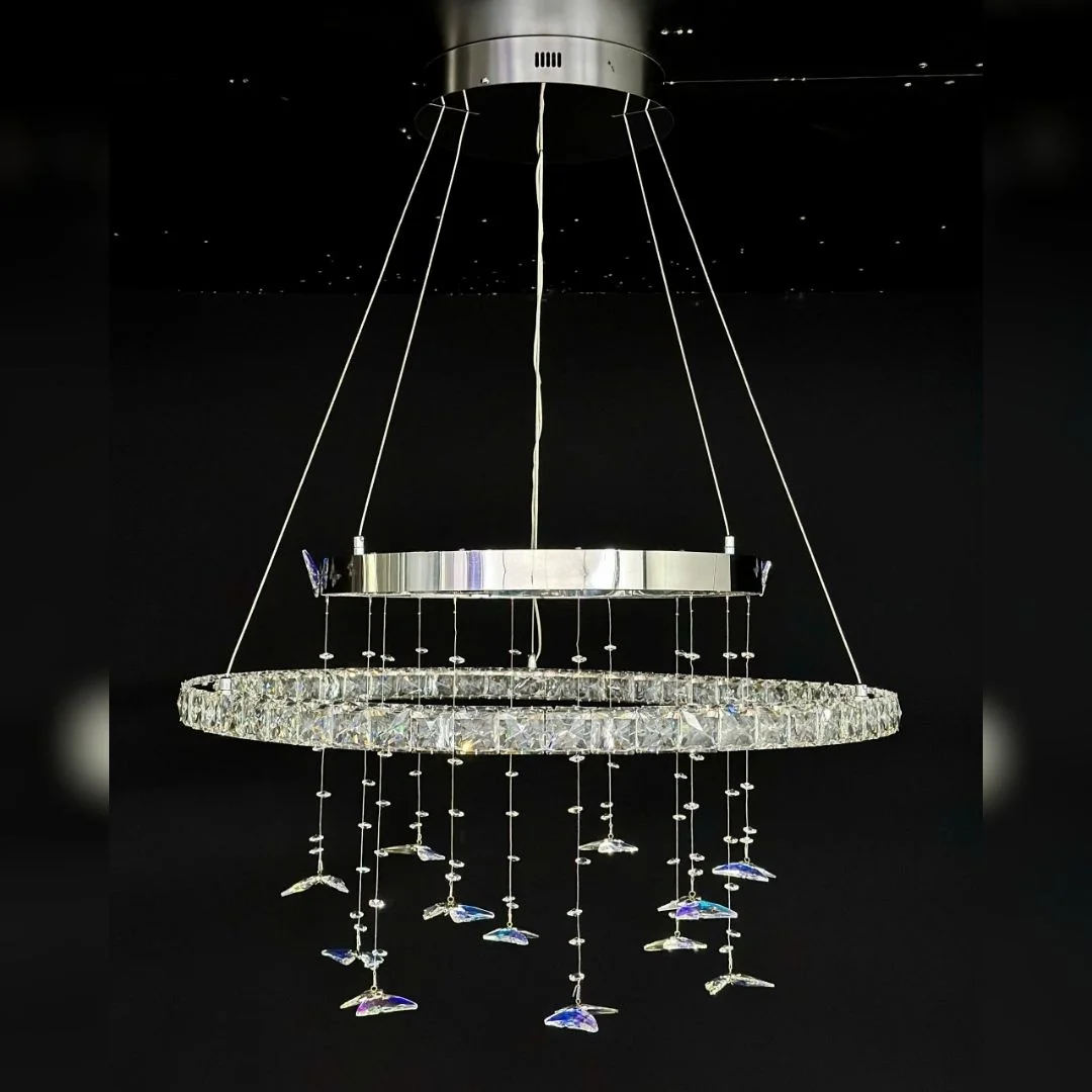 Chất liệu chính là pha lê cao cấp có độ trong suốt cao, bắt sáng tốt, giúp ánh sáng LED trở nên mềm mại và nổi bật hơn. Khung đèn làm từ kim loại sơn tĩnh điện, mang lại sự chắc chắn, hạn chế han gỉ và đảm bảo độ bền trong thời gian dài. Sự kết hợp này vừa tăng tính thẩm mỹ, vừa mang lại độ an toàn và ổn định khi sử dụng trong không gian gia đình.