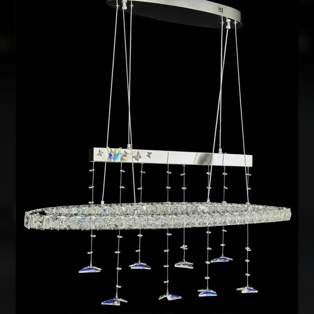 Đèn Thả Pha Lê TPL93 sở hữu kiểu dáng dạng thanh dài, kết hợp cùng hàng loạt dây pha lê thả xuống tạo thành hiệu ứng ánh sáng nhiều tầng. Khi nhìn trực diện, sản phẩm mang đến cảm giác như một dải pha lê rực rỡ đang lơ lửng giữa không gian. Từng hạt pha lê được cắt góc tinh tế, giúp ánh sáng phản chiếu lung linh, tạo nên vẻ đẹp sang trọng và đẳng cấp.
