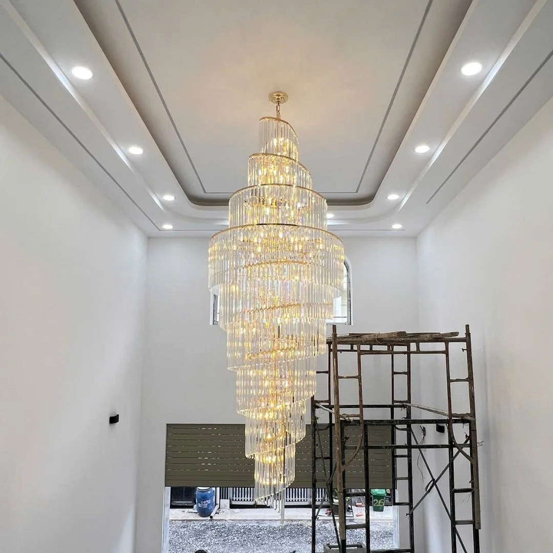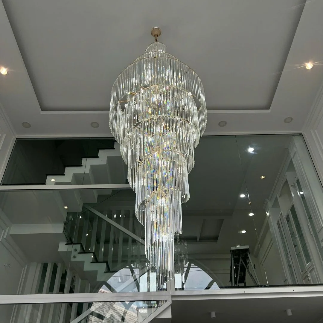 Đèn thả pha lê TPL9662 có kiểu dáng thả tầng theo chiều dọc, các vòng tầng được thu nhỏ dần từ trên xuống dưới tạo cảm giác mềm mại và thanh thoát. Phần thân đèn được tạo nên từ nhiều thanh pha lê dài, thẳng và đều, khi nhìn từ xa giống như một “dòng ánh sáng” rủ xuống trần. Pha lê trong suốt giúp bắt sáng tốt, tạo hiệu ứng lấp lánh rõ nhưng vẫn giữ sự tinh tế, phù hợp không gian sang trọng. Khung hợp kim cao cấp giúp kết cấu chắc chắn, giữ form ổn định và hỗ trợ treo an toàn ở vị trí trần cao khi lắp đặt đúng kỹ thuật.
