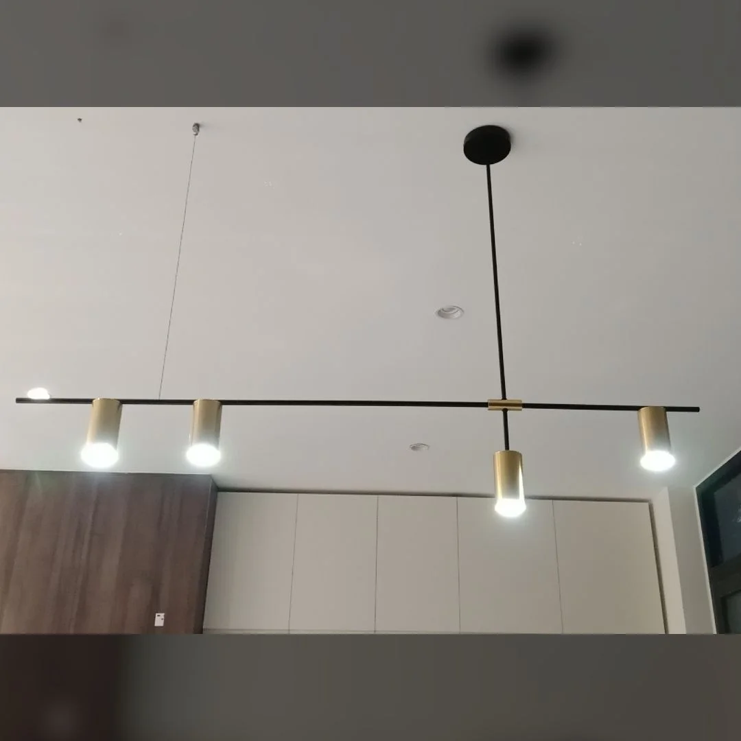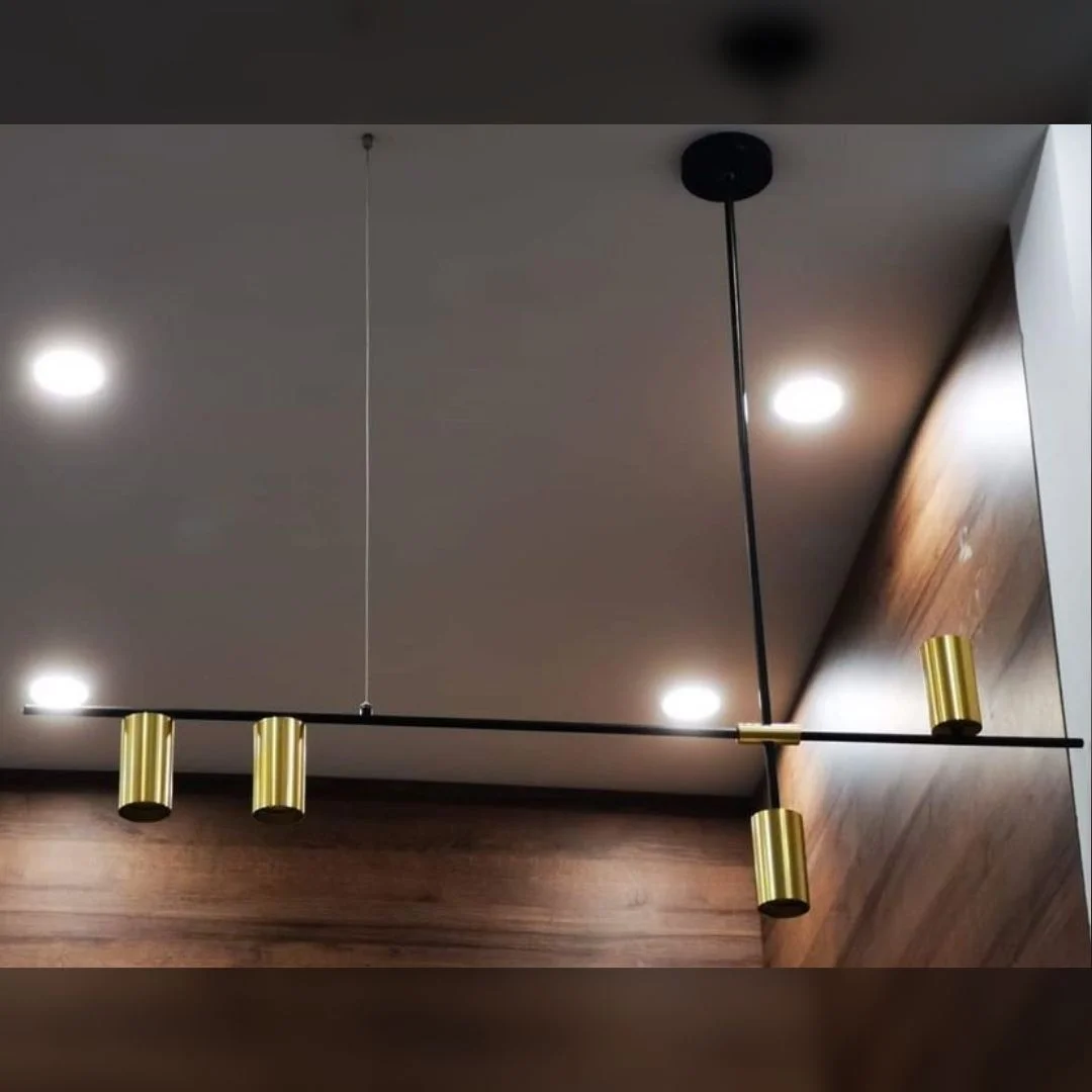 Mẫu đèn này nổi bật với thiết kế thanh ngang kéo dài, tạo cảm giác gọn, thoáng và rất hợp với các không gian nội thất hiện đại. Trên thân đèn là 4 đầu đèn hình trụ được bố trí theo nhịp lệch nhau, giúp tổng thể sản phẩm bớt đơn điệu và có chiều sâu thị giác rõ ràng hơn. Chính cách sắp xếp này làm cho chiếc đèn không chỉ đóng vai trò chiếu sáng mà còn trở thành một chi tiết decor đầy tinh tế cho bàn ăn, quầy bar, đảo bếp hoặc khu vực tiếp khách. Với tỷ lệ L1230 x H650, sản phẩm đặc biệt phù hợp với những không gian theo phong cách modern, minimalist, contemporary hay căn hộ yêu thích đường nét tinh giản nhưng vẫn có điểm nhấn riêng.