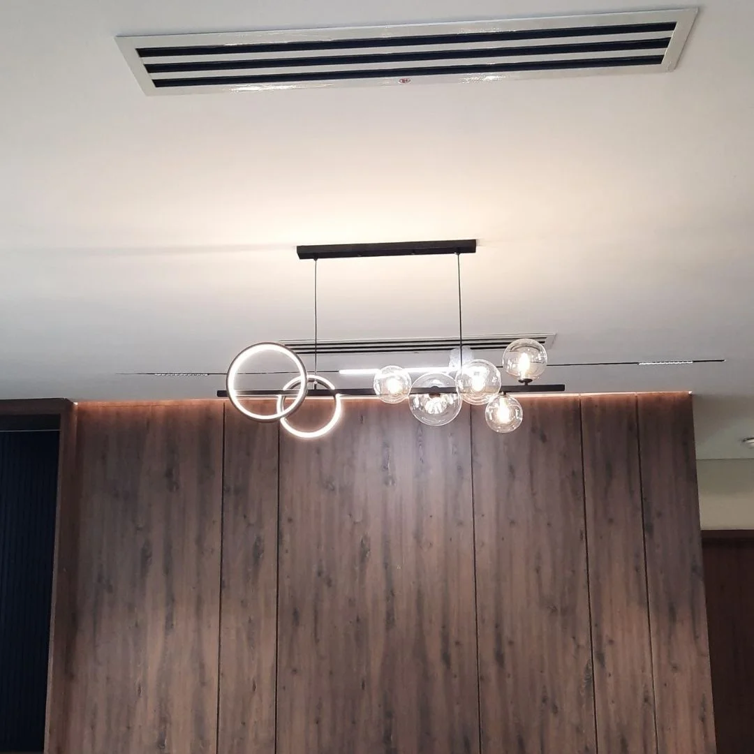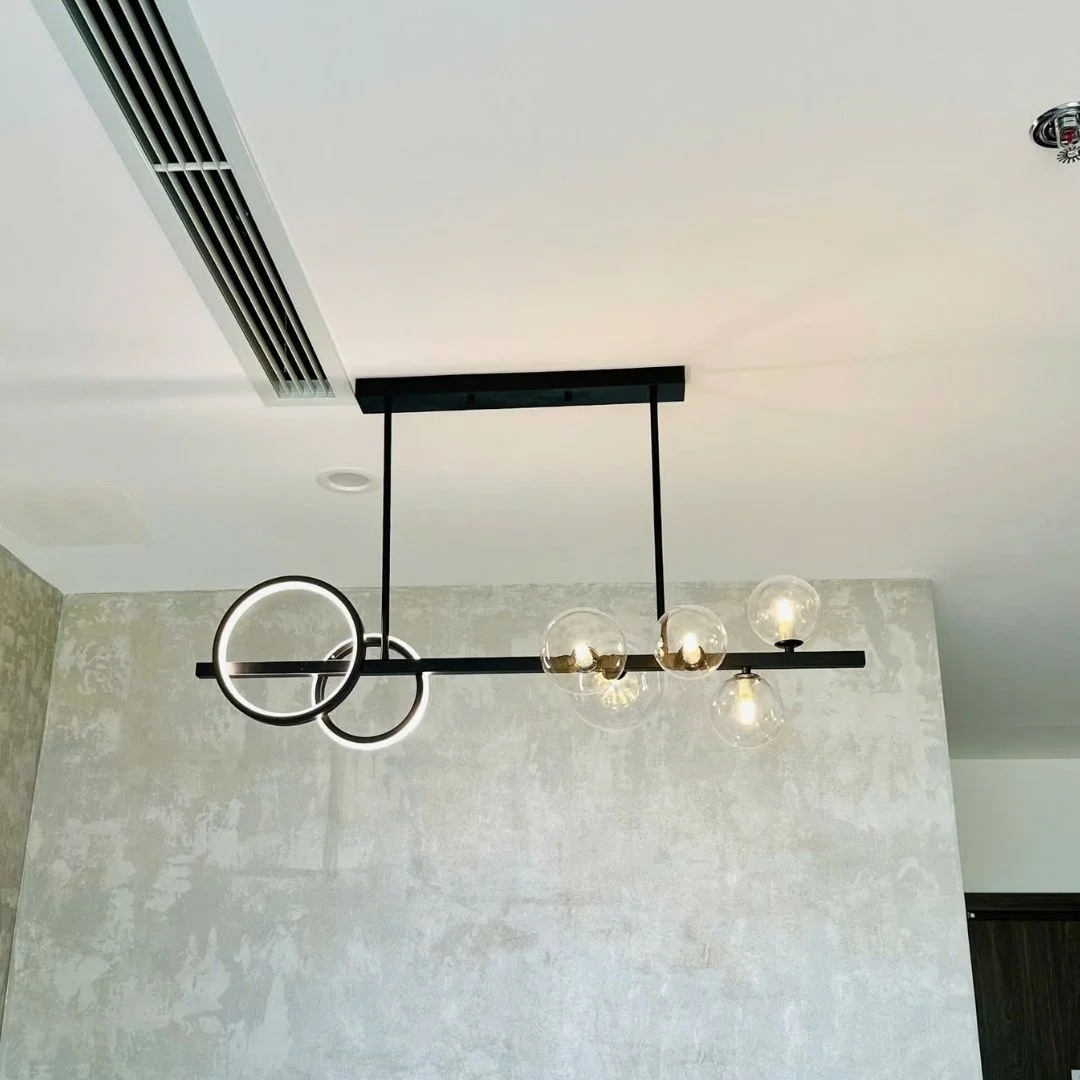 Mẫu đèn này nổi bật với thiết kế thanh ngang treo thả, trên đó kết hợp đồng thời hai ngôn ngữ tạo hình khác nhau: một bên là cụm bóng tròn mang cảm giác mềm mại, gần gũi; bên còn lại là các vòng sáng LED hiện đại tạo điểm nhấn rõ ràng. Sự đối lập giữa hình cầu và hình vòng giúp tổng thể sản phẩm trở nên sinh động, có chiều sâu và dễ thu hút ánh nhìn ngay khi bước vào không gian. Tông màu đen của khung đèn giúp bố cục trông sắc nét hơn, đồng thời làm nổi bật phần ánh sáng để mẫu đèn trở thành tâm điểm thẩm mỹ cho bàn ăn, đảo bếp, quầy bar hoặc những khu vực sinh hoạt theo phong cách modern, contemporary, minimalist hay căn hộ trẻ trung, cá tính.
