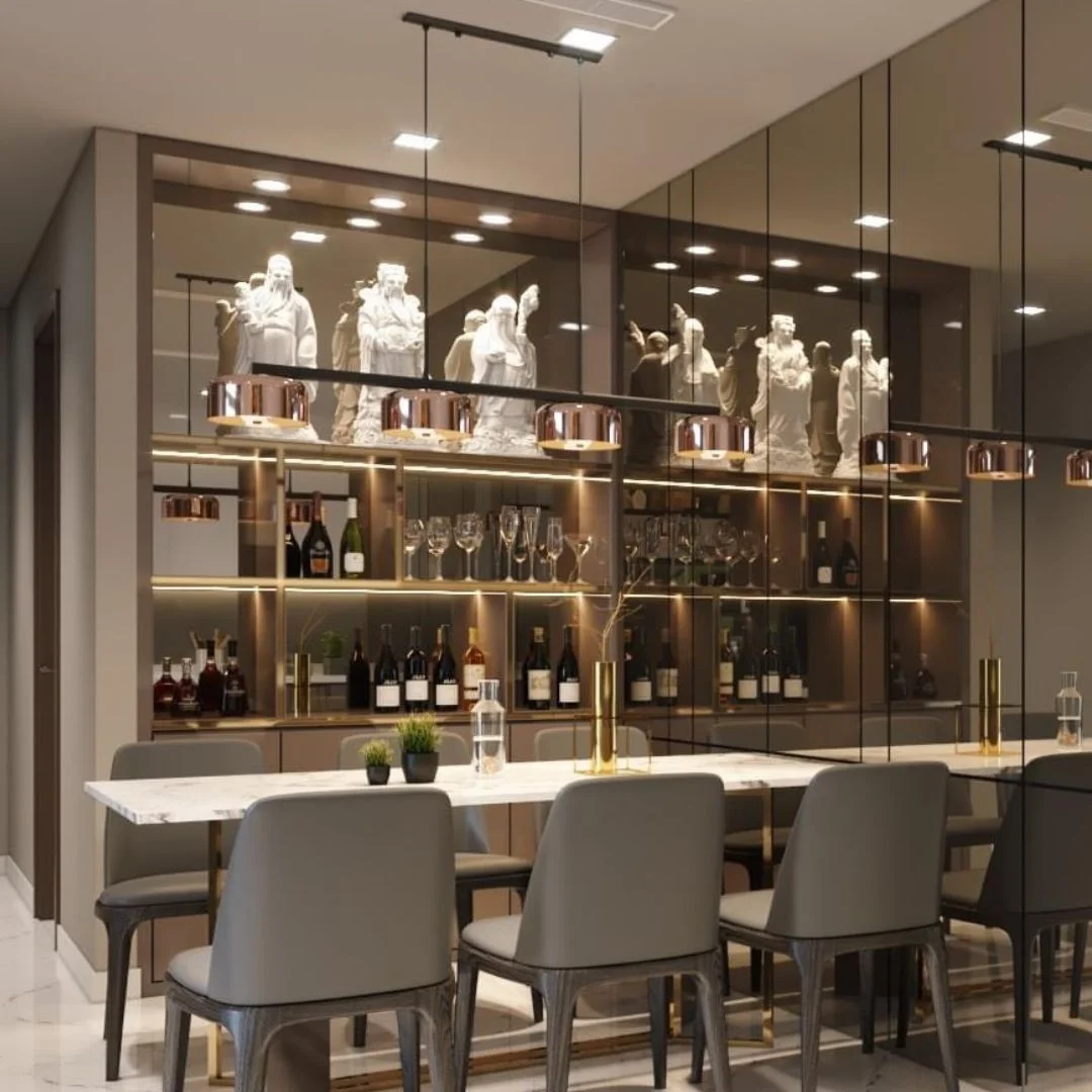 - Thiết kế thanh ngang kết hợp 4 chao xi hồng giúp không gian có điểm nhấn rõ ràng hơn, tạo cảm giác hiện đại và sang hơn ngay từ ánh nhìn đầu tiên.