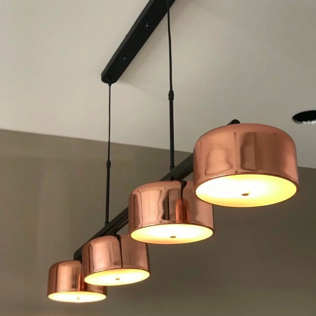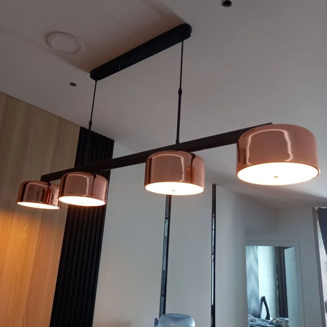 Mẫu đèn này nổi bật với thiết kế thanh ngang dài treo thả bằng hai trụ dọc chắc chắn, tạo nên tổng thể cân đối và rất phù hợp với những không gian có bố cục theo chiều ngang. Điểm nhấn đáng chú ý nằm ở 4 chao đèn hình trụ bo tròn, hoàn thiện bề mặt xi hồng bóng đẹp, tạo cảm giác sang trọng nhưng vẫn trẻ trung và hiện đại. Các chao được bố trí đều dọc theo thân đèn, giúp sản phẩm trông gọn gàng, chỉn chu và tạo hiệu ứng thị giác rõ ràng cho khu vực bên dưới. Với chiều dài L1350, mẫu đèn này đặc biệt phù hợp với bàn ăn dài, quầy bar, đảo bếp hoặc không gian bếp mở theo phong cách modern, contemporary, industrial nhẹ hay nội thất tối giản có điểm nhấn tinh tế.