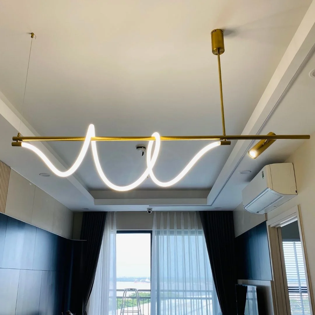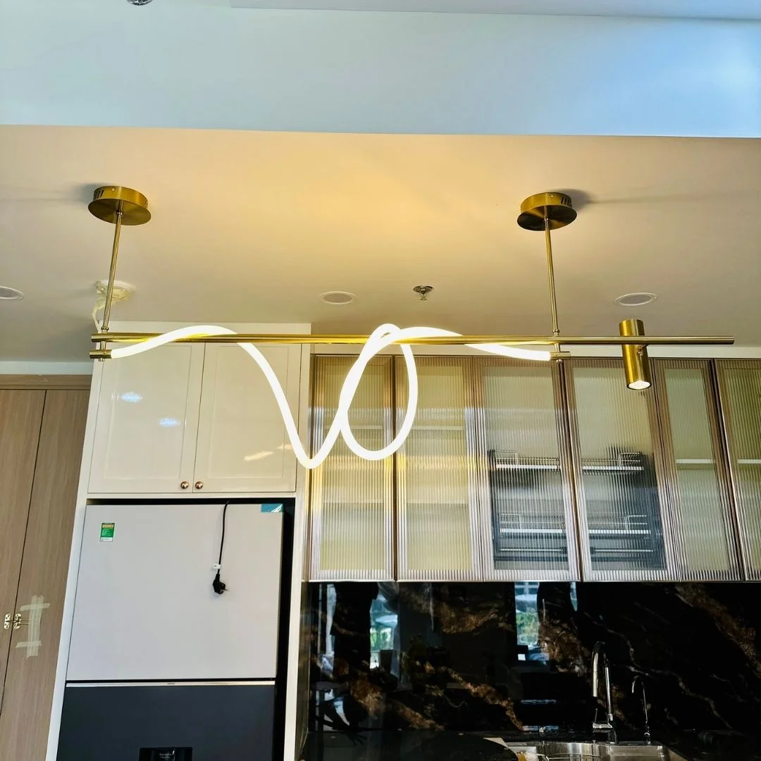 Mẫu đèn thả thiết kế TTK124 nổi bật với thiết kế thanh ngang dài treo thả bằng hai trụ mảnh, tạo nên tổng thể gọn gàng và rất hiện đại. Điểm đặc biệt nằm ở dải sáng uốn lượn mềm chạy dọc theo thân đèn, tạo cảm giác như một nét vẽ ánh sáng đang chuyển động trong không gian. Kết hợp với chi tiết đèn phụ dạng ống đặt lệch ở một đầu, sản phẩm mang lại bố cục vừa cân bằng vừa có điểm nhấn khác biệt, giúp không gian bếp, bàn ăn hay quầy bar trở nên sinh động và có chiều sâu hơn. Với chiều dài L1200, mẫu đèn này đặc biệt phù hợp với đảo bếp, bàn ăn dài, quầy bar, khu vực sinh hoạt mở hoặc những không gian theo phong cách modern, contemporary, minimalist và modern luxury.