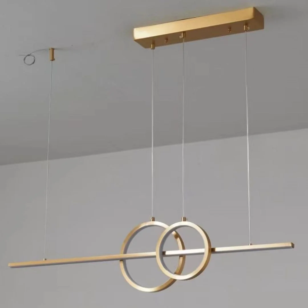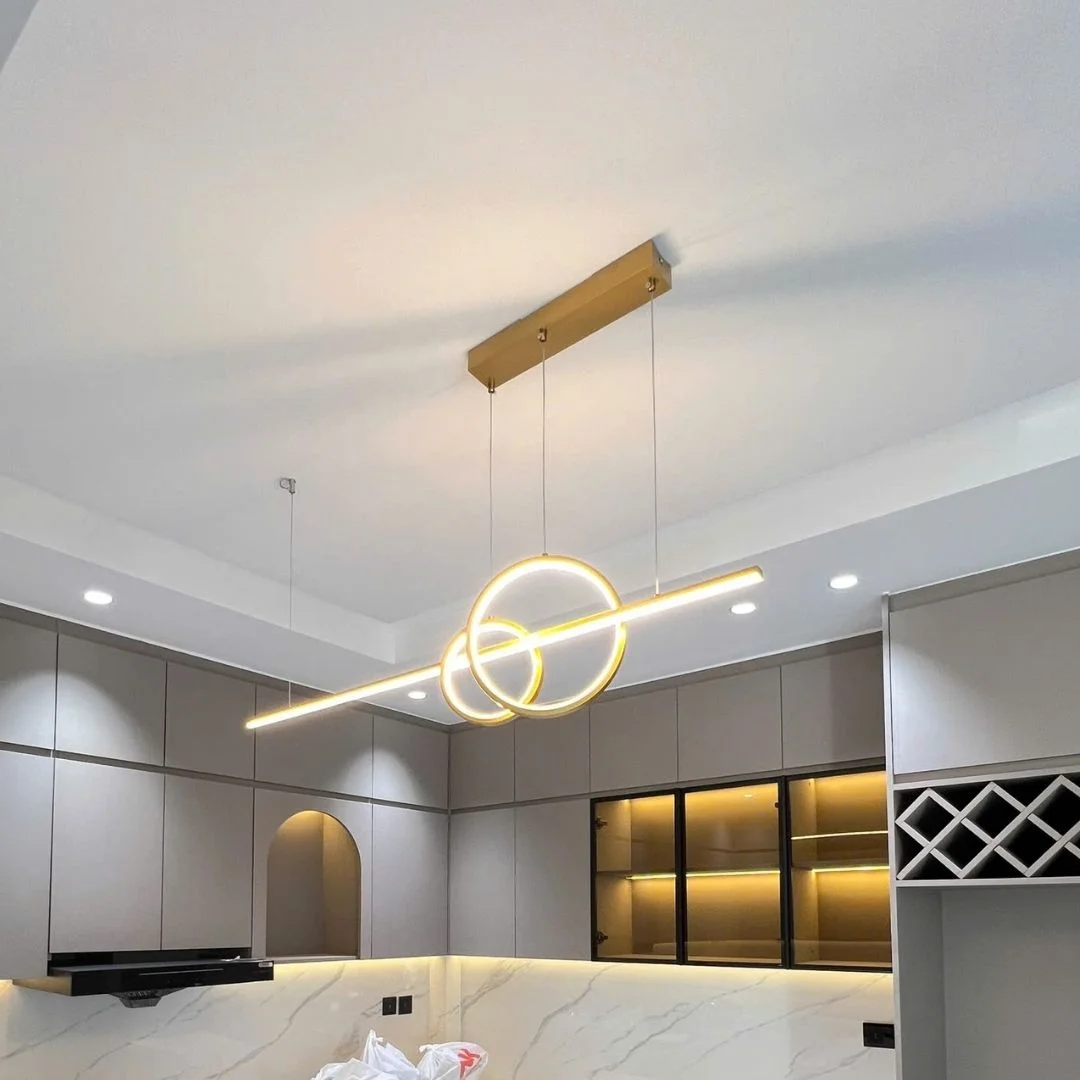 Mẫu đèn này nổi bật với cấu trúc thanh ngang kéo dài, kết hợp hai vòng tròn ánh sáng bố trí lệch nhẹ trên thân đèn, tạo nên tổng thể hiện đại và có chiều sâu thị giác rõ ràng. Phần thanh đèn mảnh giúp sản phẩm giữ được cảm giác gọn gàng, trong khi hai vòng sáng lại đóng vai trò như điểm nhấn chính, khiến chiếc đèn vừa có công năng chiếu sáng vừa có giá trị trang trí nổi bật. Khi treo phía trên bàn ăn, quầy bar hay đảo bếp, đèn tạo nên một trục thị giác đẹp mắt, rất phù hợp với những không gian theo phong cách modern, contemporary, minimalist hay modern luxury.