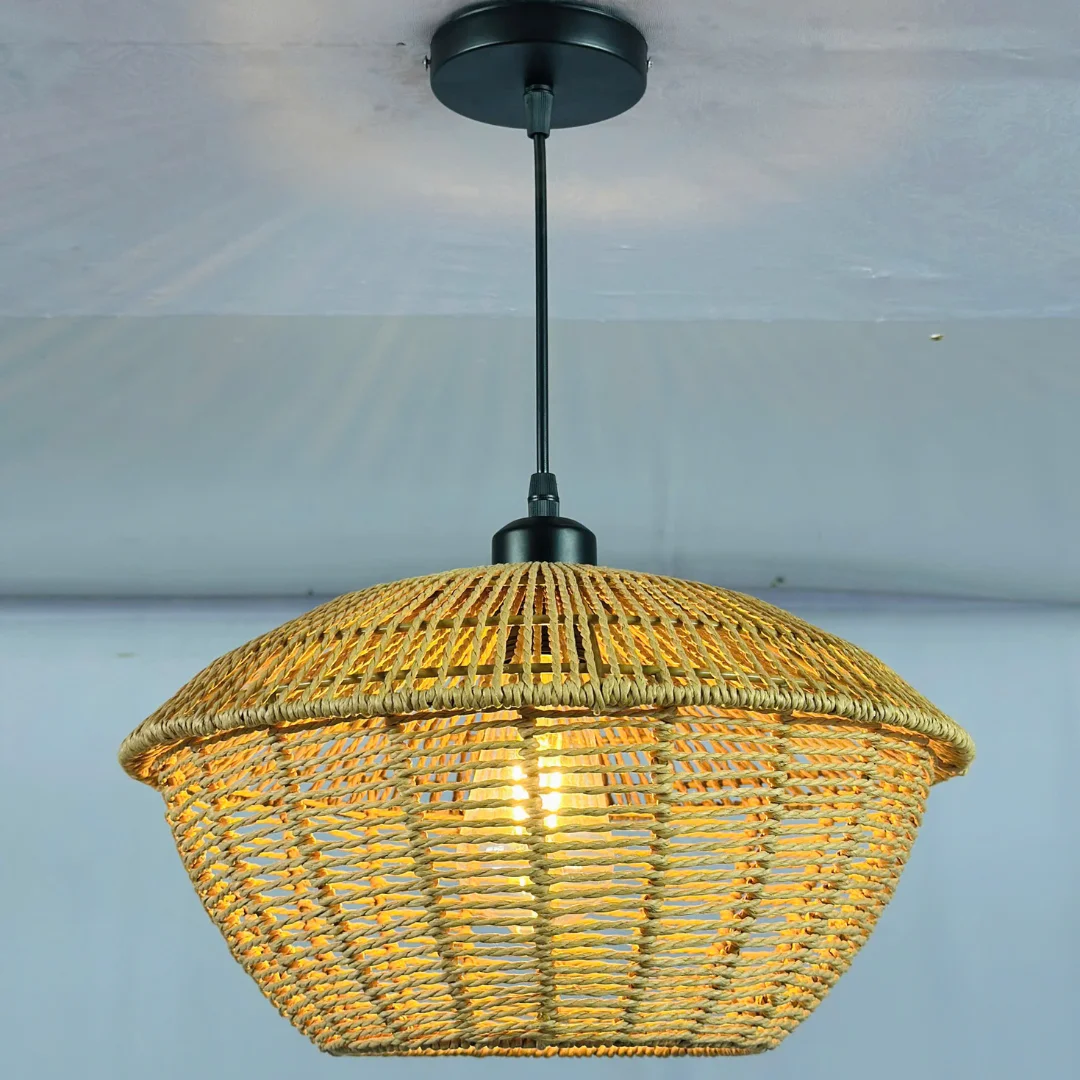 Tông màu mây tre tự nhiên mang lại cảm giác gần gũi, phù hợp với nhà có nội thất gỗ, tường sáng, phong cách tối giản hoặc Japandi. Phần đế trần và dây treo màu đen tạo sự “khóa” tổng thể, làm đèn trông sạch sẽ, hiện đại và dễ phối trong nhiều không gian khác nhau.