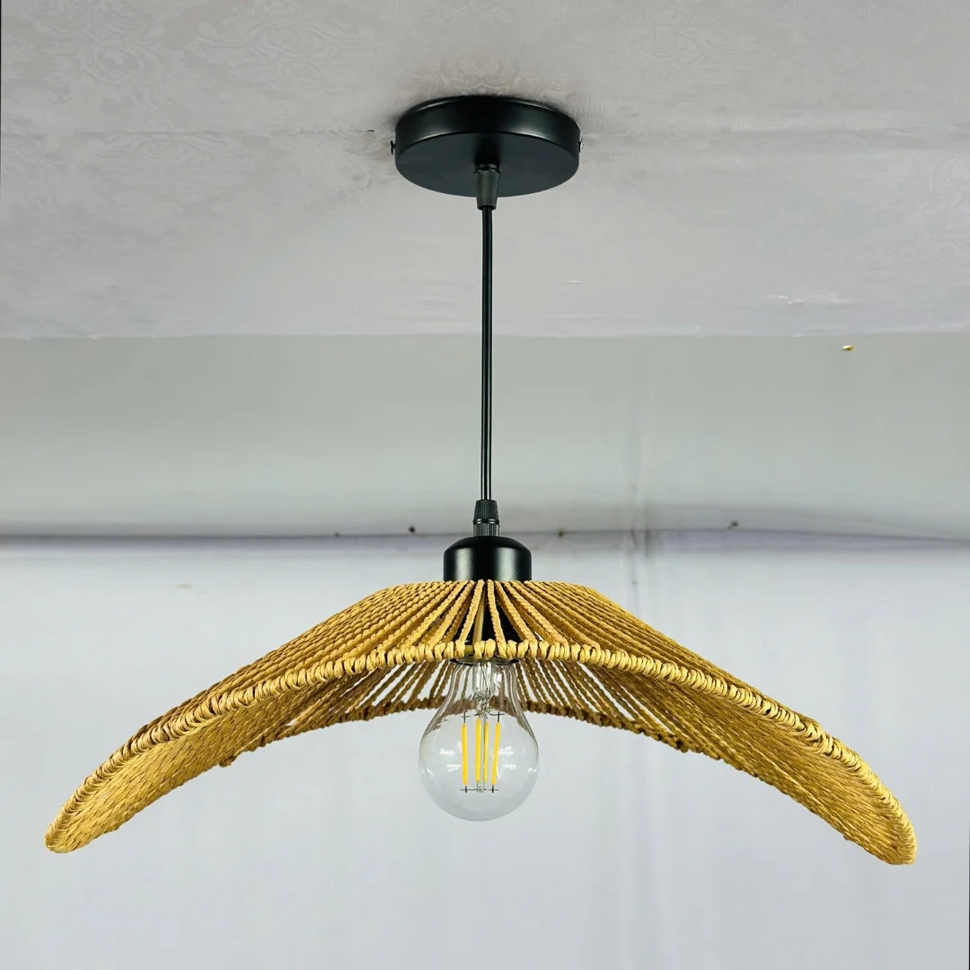 Bề mặt đan cho phép ánh sáng xuyên qua một cách mềm mại, tạo vùng sáng ấm và dễ chịu. Khi dùng bóng E27 ánh vàng, không gian sẽ có cảm giác gần gũi, phù hợp nhà phố, căn hộ, quán cà phê hoặc các góc decor theo phong cách tự nhiên, tối giản, Japandi, Tropical.