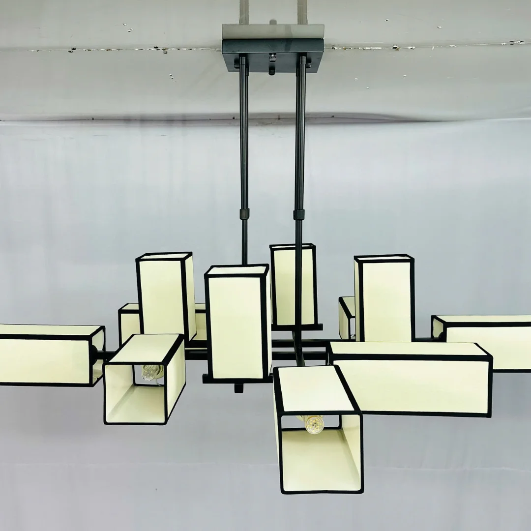 Về chất liệu, phần khung được hoàn thiện theo hướng chắc chắn, cứng cáp, phù hợp treo ở các không gian cần tính bền bỉ và ổn định lâu dài. Các mảng tán sáng dạng hộp giúp ánh sáng mềm hơn, dễ chịu cho mắt và tạo hiệu ứng ánh sáng “đều – đẹp” khi bật 12 bóng E27, rất hợp cho phòng khách, bàn ăn hoặc sảnh.