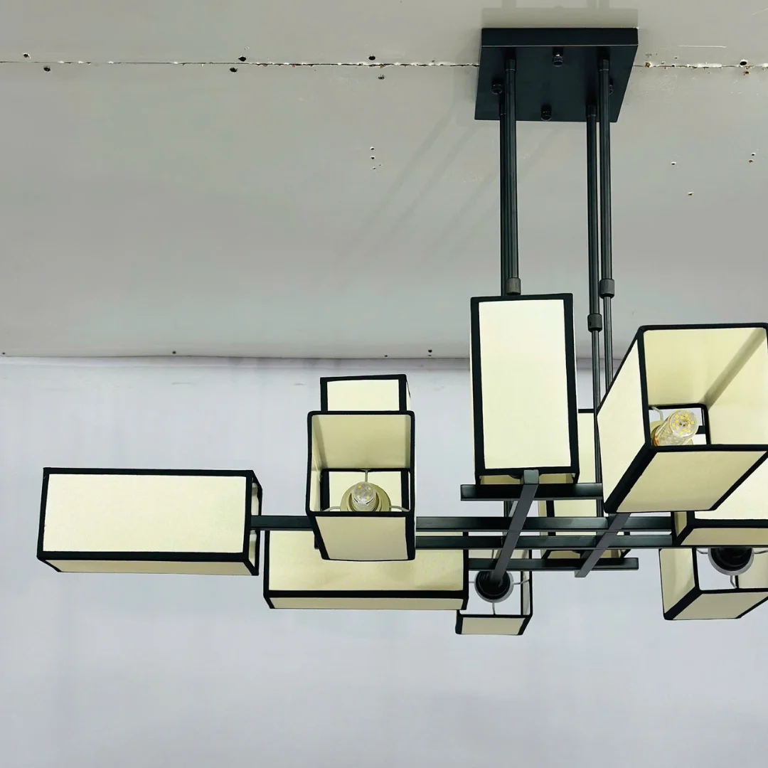 Đèn Thả Thiết Kế TTK300 gây ấn tượng ngay từ cái nhìn đầu tiên nhờ bố cục nhiều “khối hộp” hình chữ nhật xếp lớp, tạo cảm giác như một tác phẩm hình học treo trần. Tông màu khung đen kết hợp phần tán sáng màu kem giúp tổng thể vừa sang vừa ấm, nhìn nổi bật nhưng không bị chói gắt.