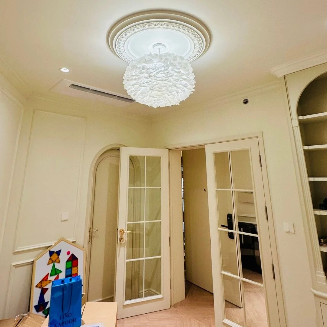 - Chất liệu cao cấp: Lông vũ giúp đèn bền đẹp lâu dài, khung kim loại chắc chắn.