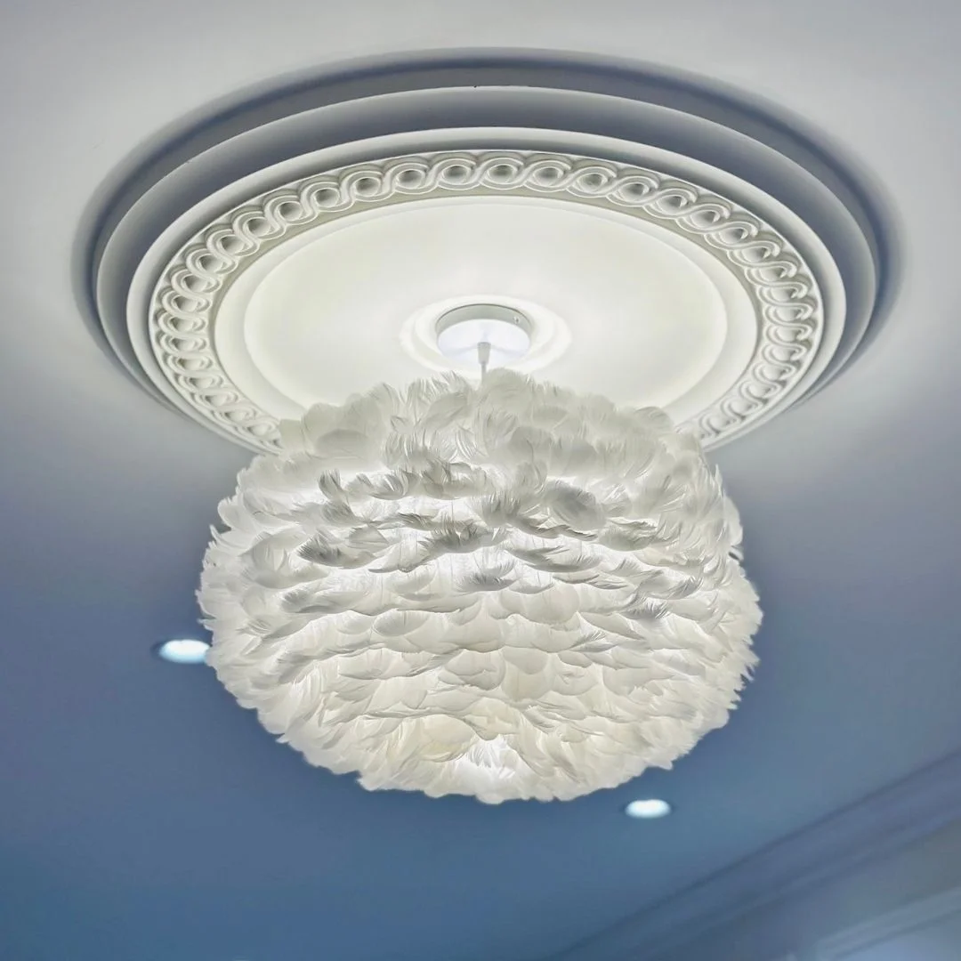 Ánh sáng từ đèn tạo không gian chiếu sáng ấm áp và dễ chịu, phù hợp với những không gian thư giãn. Chất liệu lông vũ giúp đèn tỏa ra ánh sáng một cách dịu dàng, không gây chói mắt, tạo nên sự thư thái cho không gian sống.